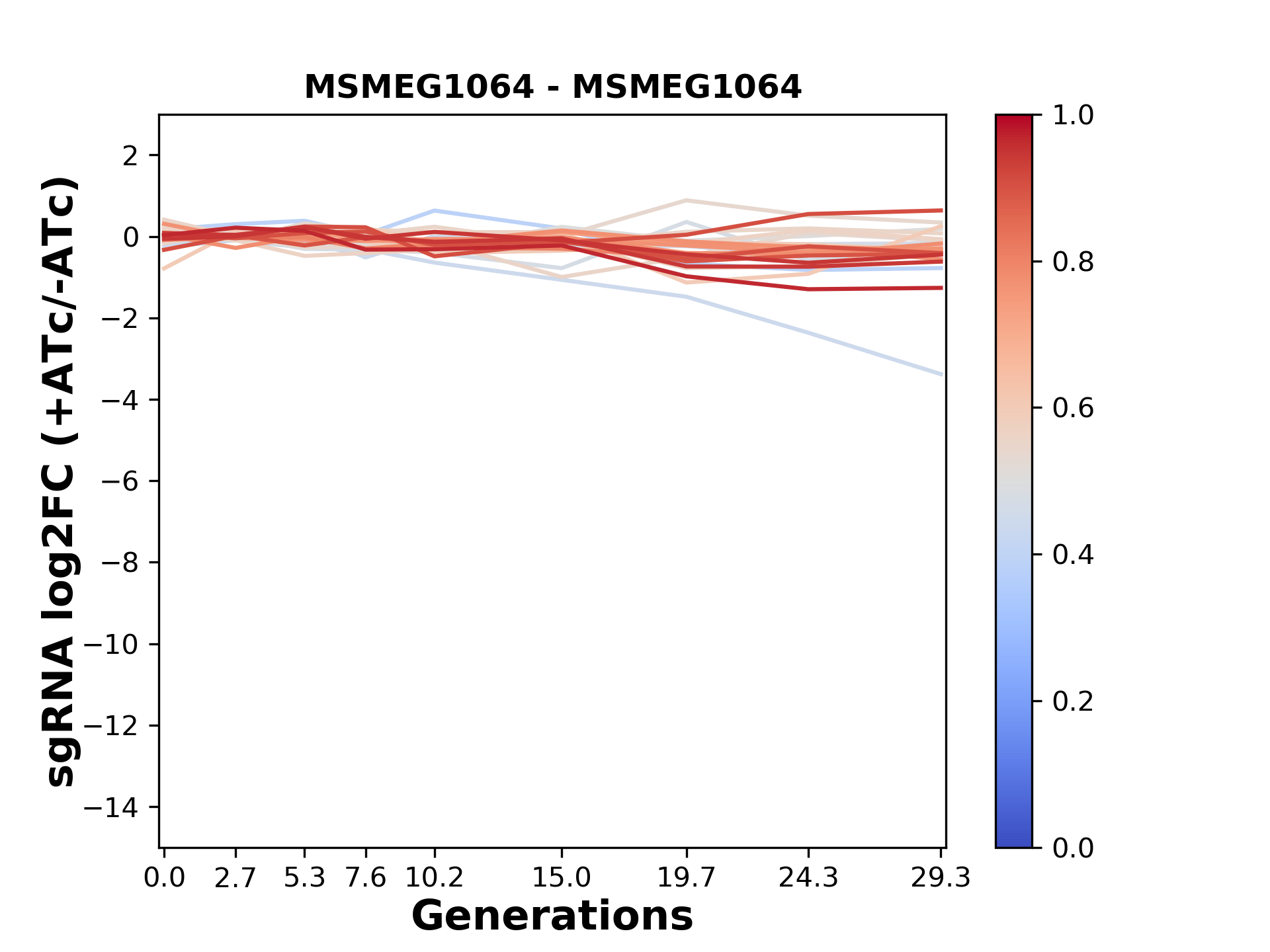 Here, we show sgRNA log2 fold-change values (L2FC) (plus versus minus ATc) over consecutive generations for sgRNAs targeting the gene you selected.
