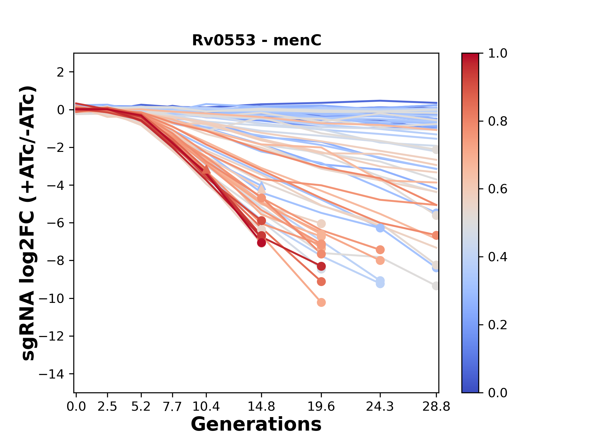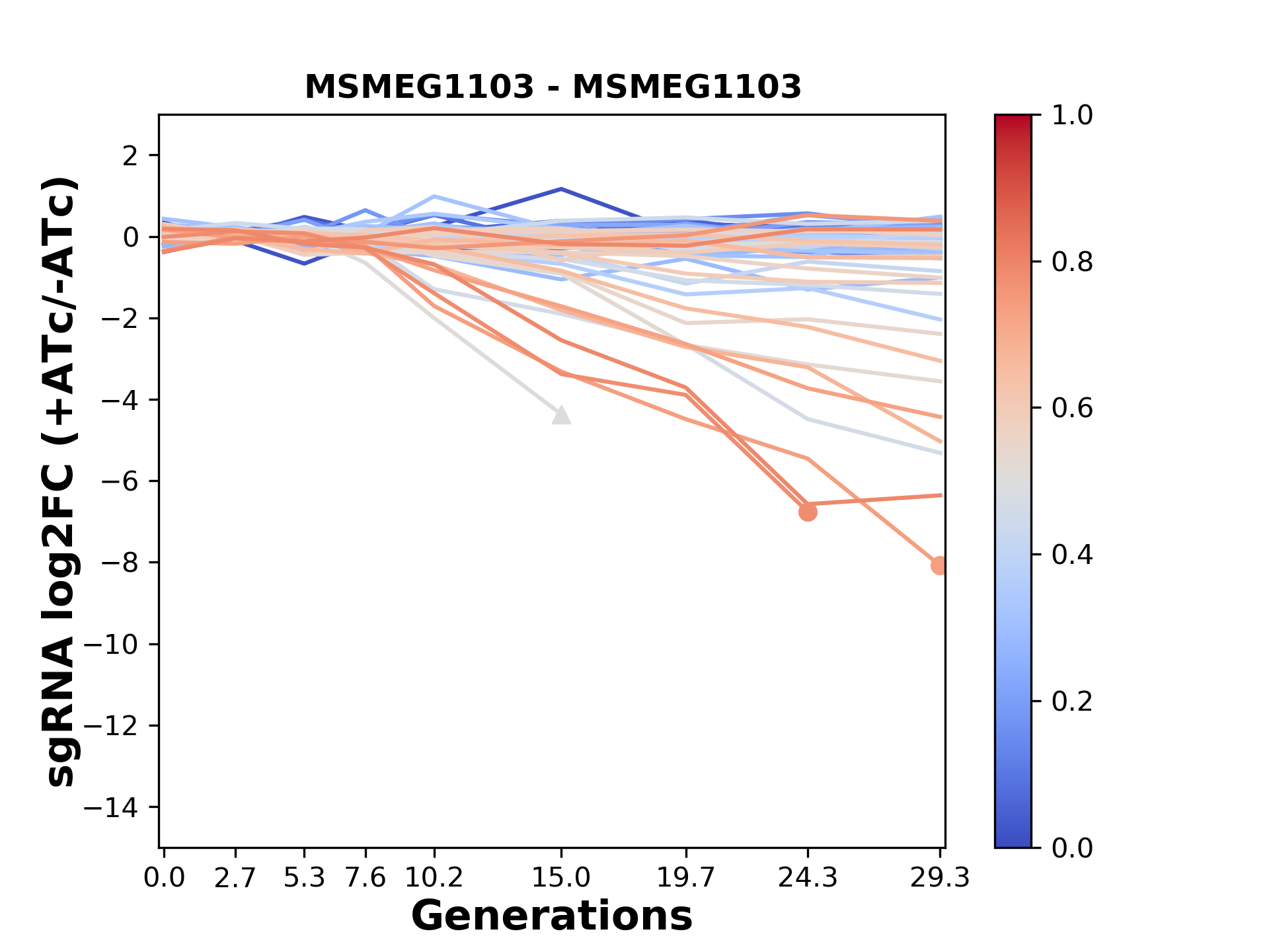 Here, we show sgRNA log2 fold-change values (L2FC) (plus versus minus ATc) over consecutive generations for sgRNAs targeting the gene you selected.