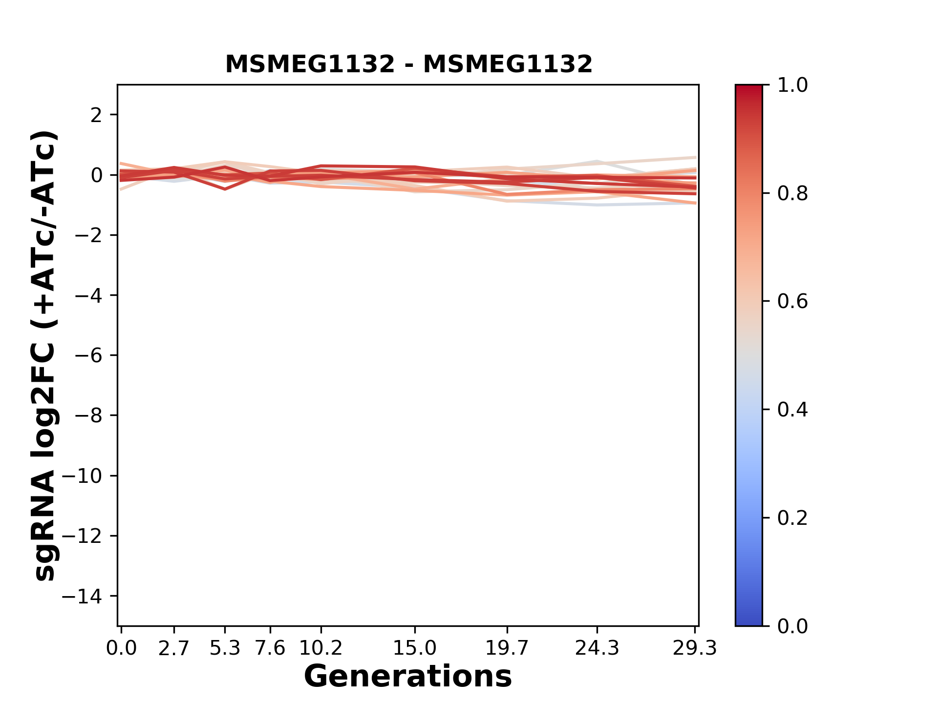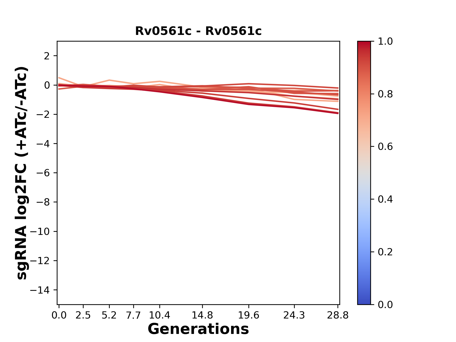 Experiment: We designed an M. tuberculosis CRISPRi library (RLC12) to target all annotated Mtb genes with single guide RNAs (sgRNAs) of varying predicted knockdown efficiencies. In parallel, we constructed a M. smegmatis CRISPRi library (RLC11) to target all annotated Msmeg genes, similar to the Mtb sgRNA library. RLC12 was transformed into M. tuberculosis H37Rv; RLC11 into M. smegmatis mc2-155. We passaged both CRISPRi libraries for nearly 30 generations in the presence or absence of the CRISPRi-inducer anhydrotetracycline (ATc). At the indicated timepoints, genomic DNA was harvested and the representation of individual sgRNAs was counted using Illumina sequencing. Here, we show sgRNA log2 fold-change values (L2FC) (plus versus minus ATc) over consecutive generations for sgRNAs targeting the gene you selected. sgRNAs are color-coded based on their predicted strength from blue (strength=0; weak) to red (strength=1; strong).