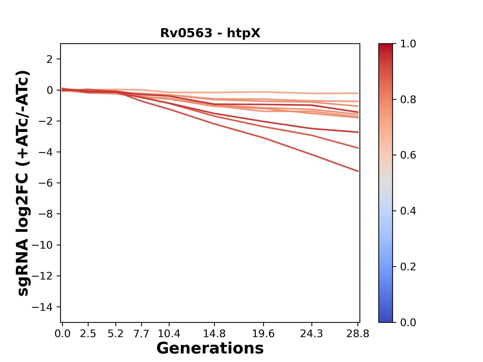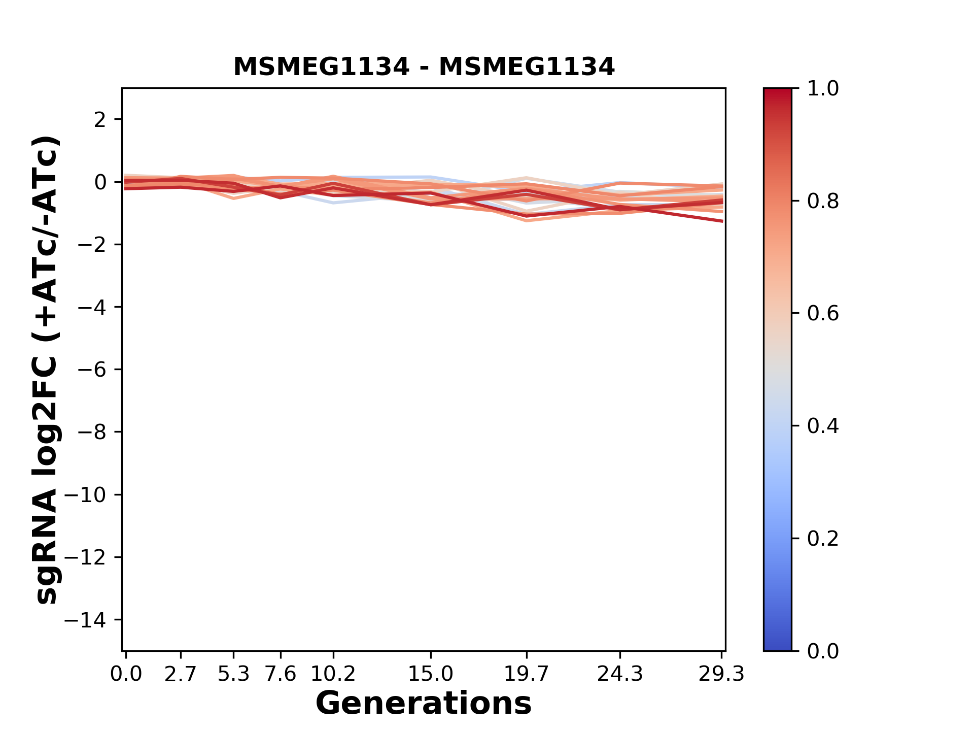 Here, we show sgRNA log2 fold-change values (L2FC) (plus versus minus ATc) over consecutive generations for sgRNAs targeting the gene you selected.