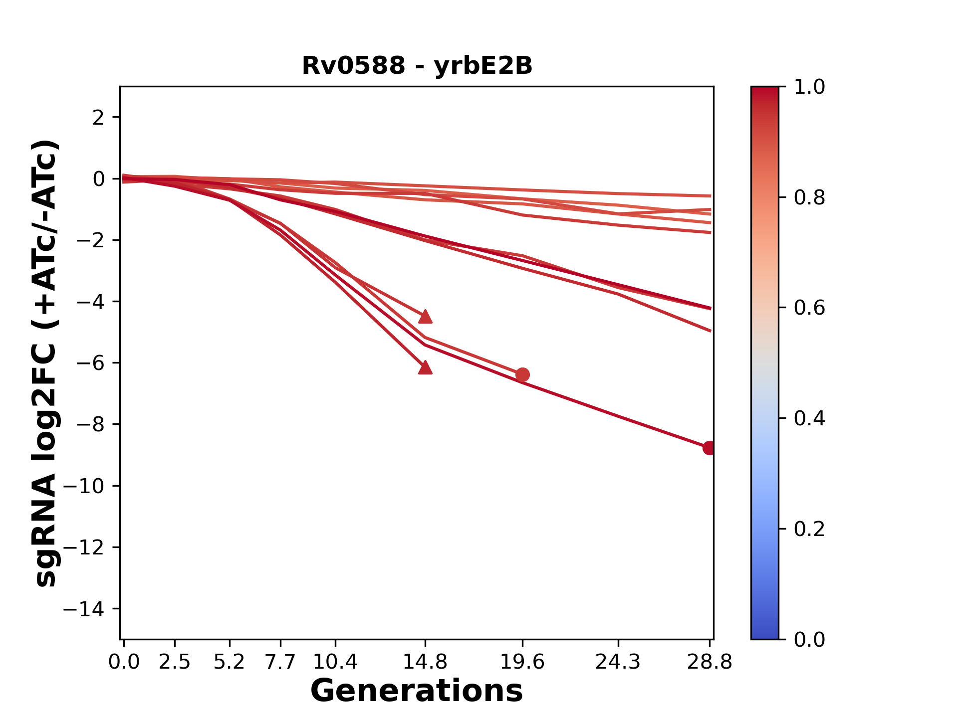 Here, we show sgRNA log2 fold-change values (L2FC) (plus versus minus ATc) over consecutive generations for sgRNAs targeting the gene you selected.