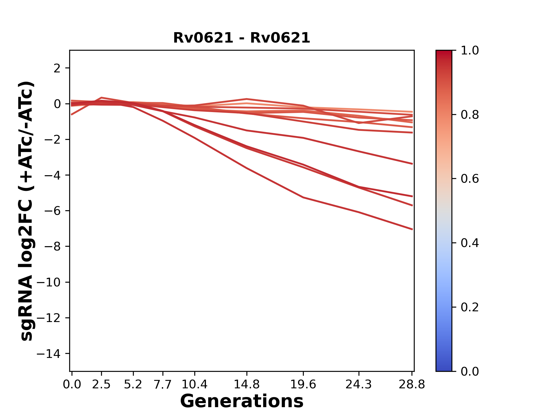Here, we show sgRNA log2 fold-change values (L2FC) (plus versus minus ATc) over consecutive generations for sgRNAs targeting the gene you selected.
