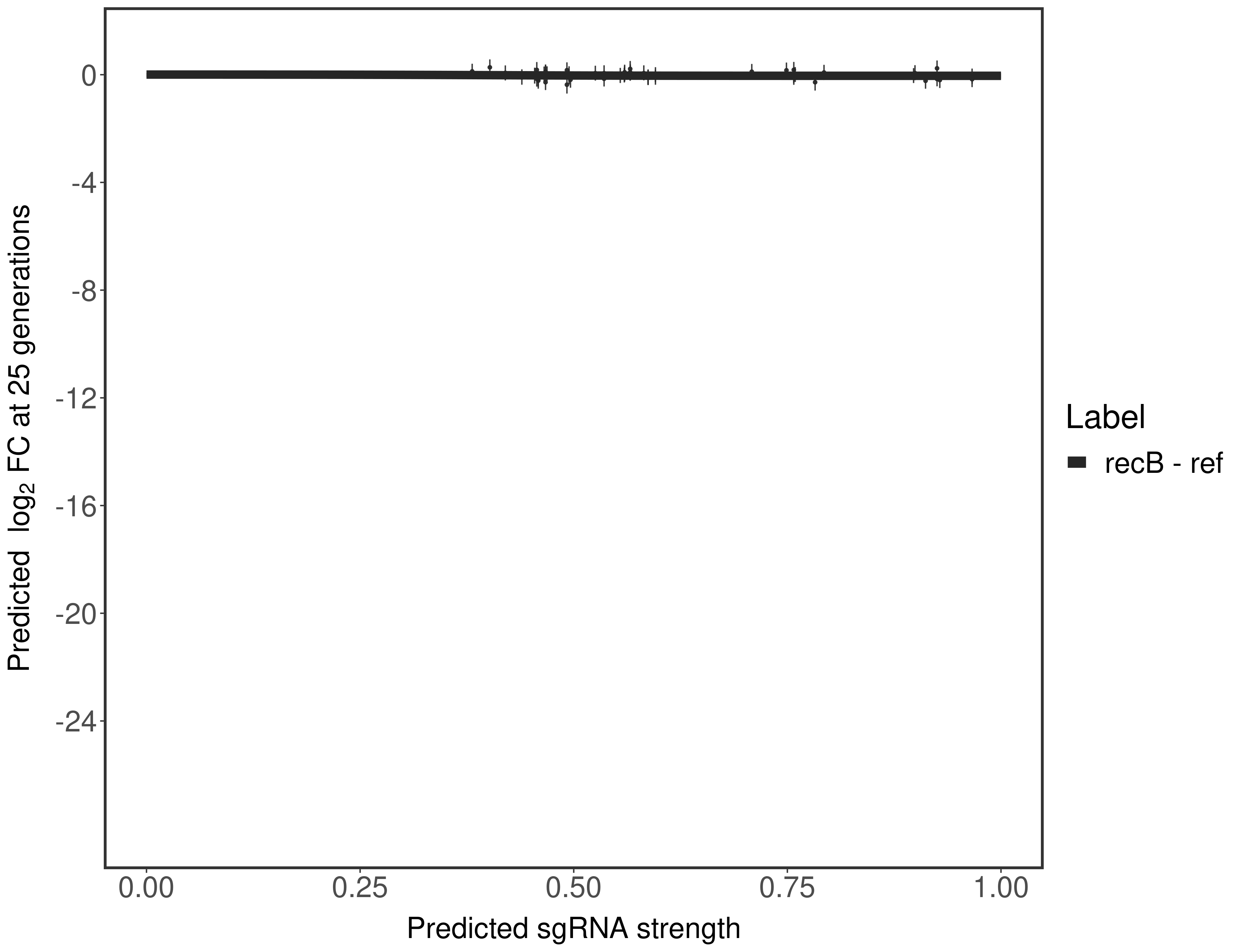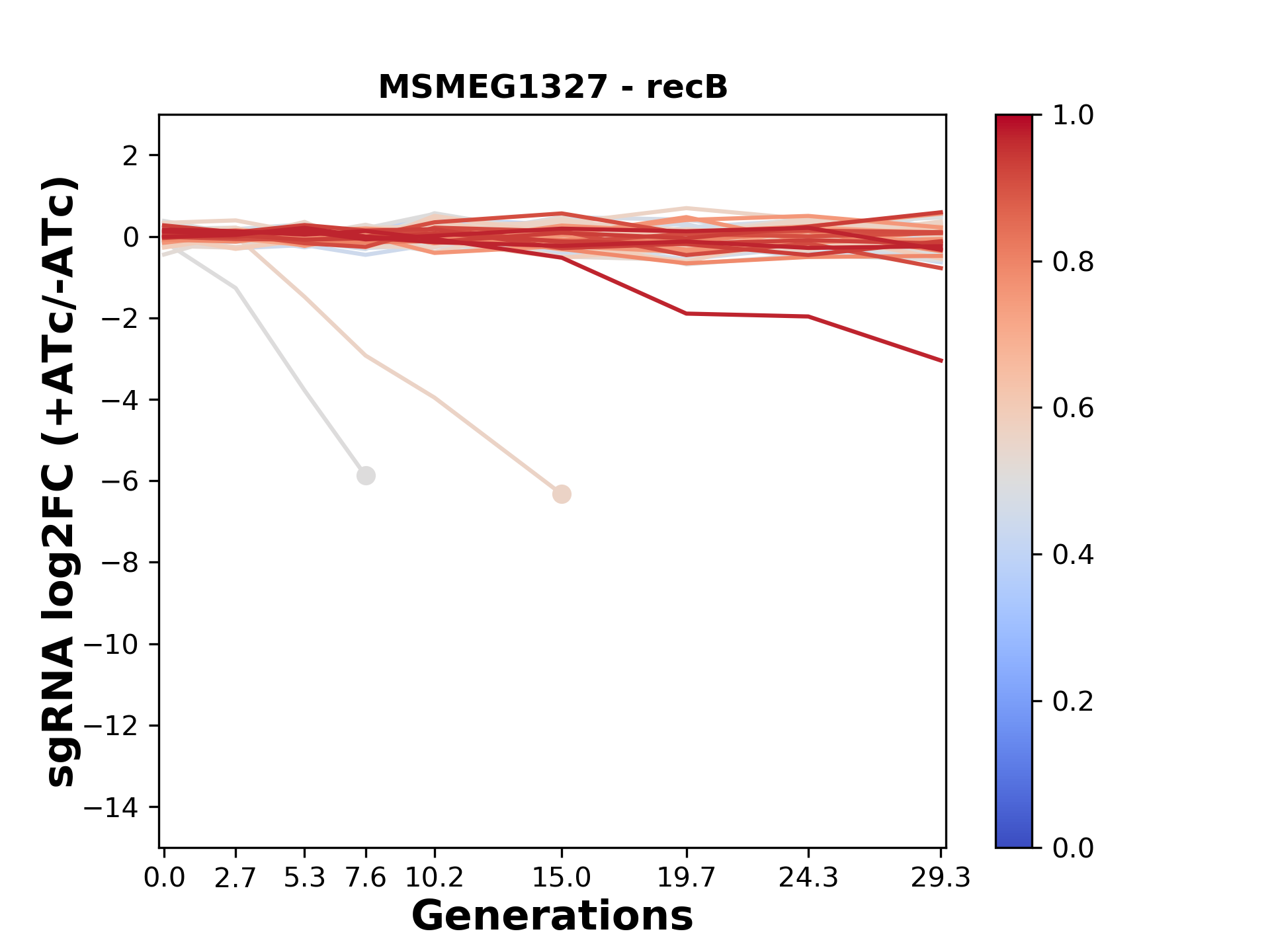 Here, we show sgRNA log2 fold-change values (L2FC) (plus versus minus ATc) over consecutive generations for sgRNAs targeting the gene you selected.