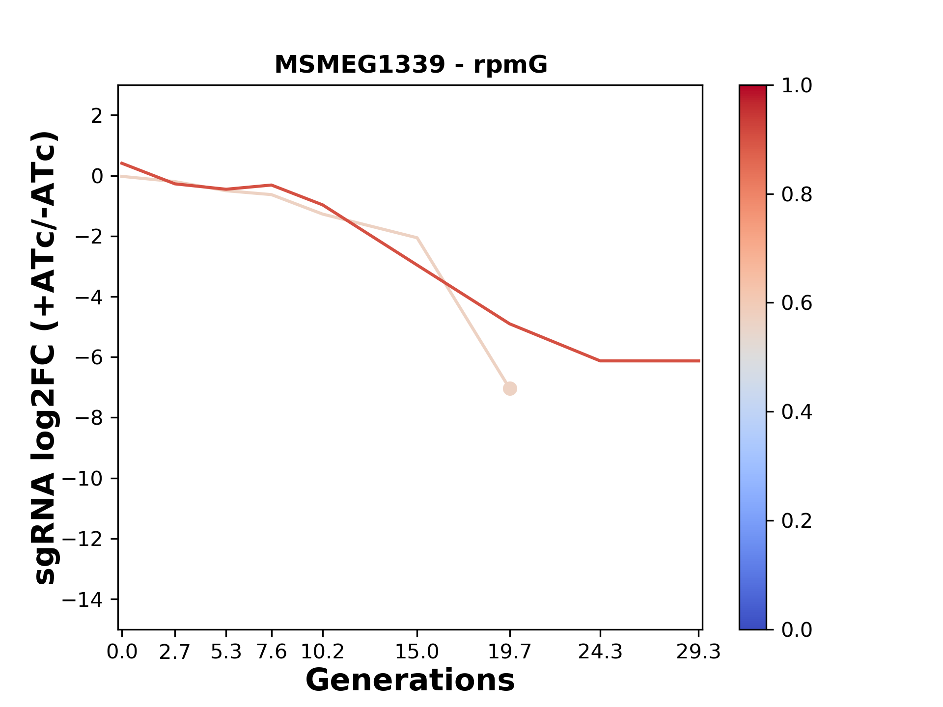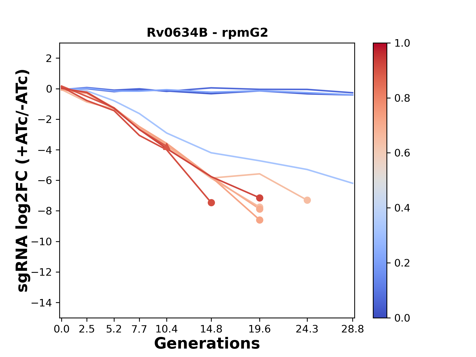 Here, we show sgRNA log2 fold-change values (L2FC) (plus versus minus ATc) over consecutive generations for sgRNAs targeting the gene you selected.