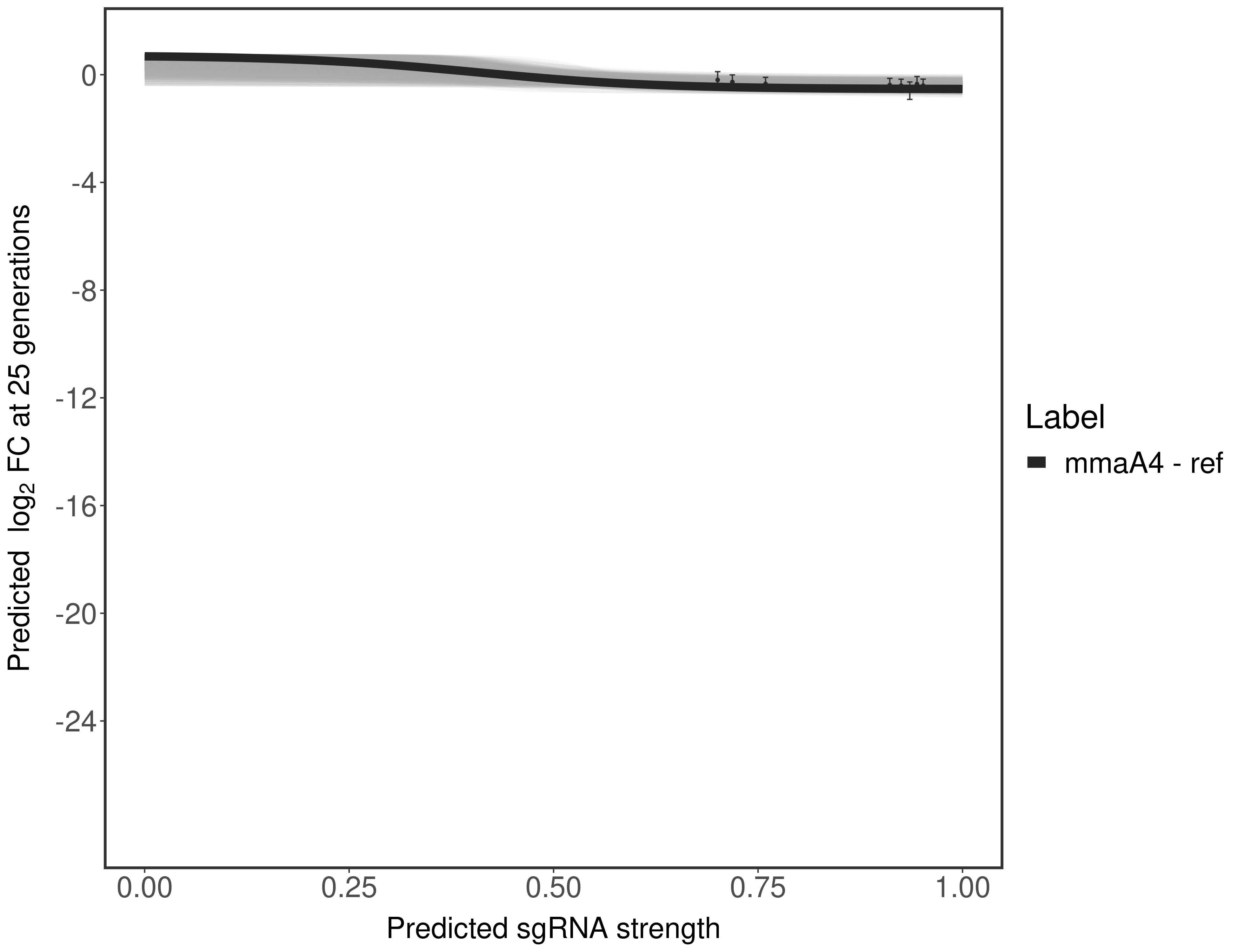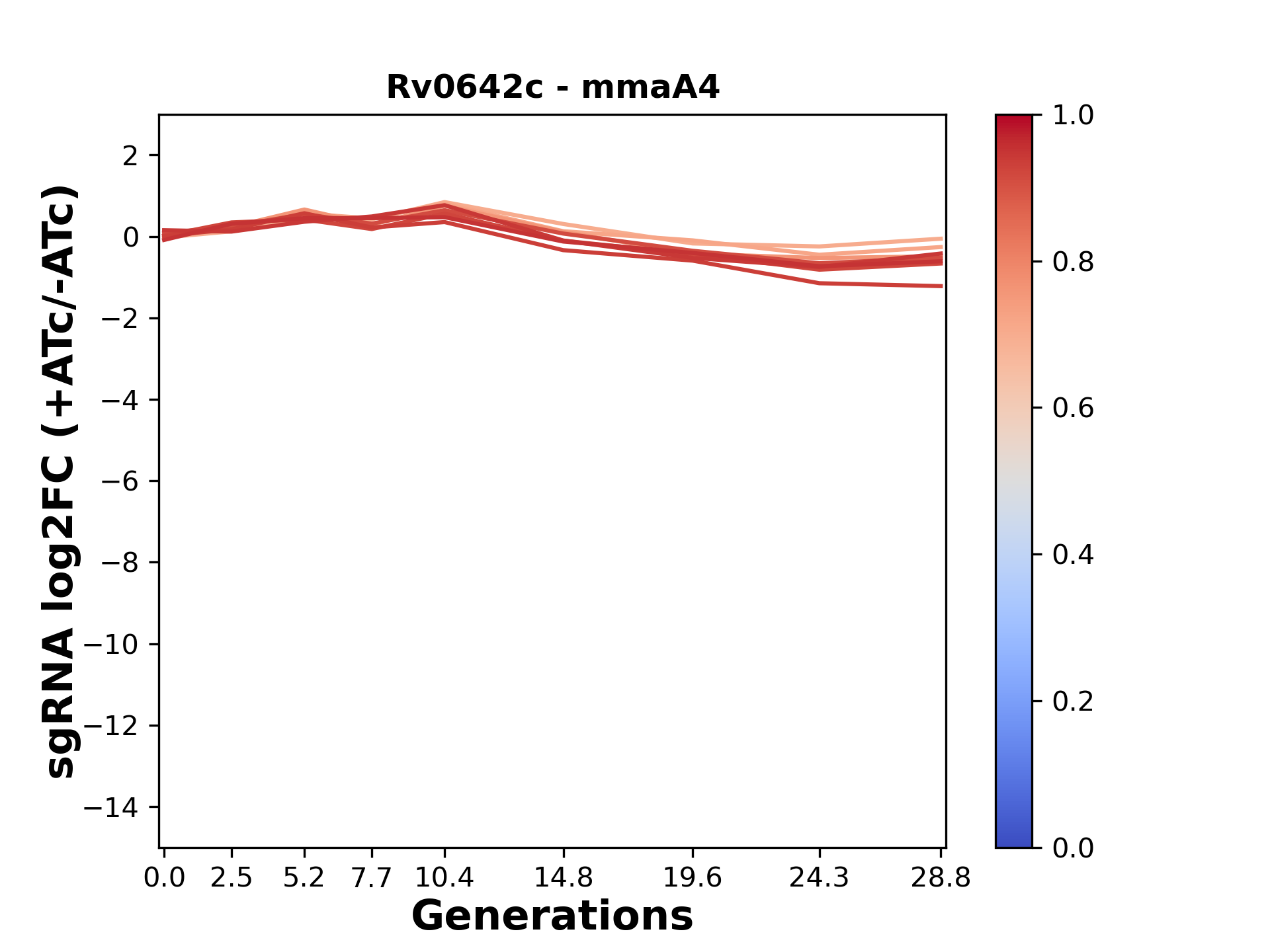 Here, we show sgRNA log2 fold-change values (L2FC) (plus versus minus ATc) over consecutive generations for sgRNAs targeting the gene you selected.