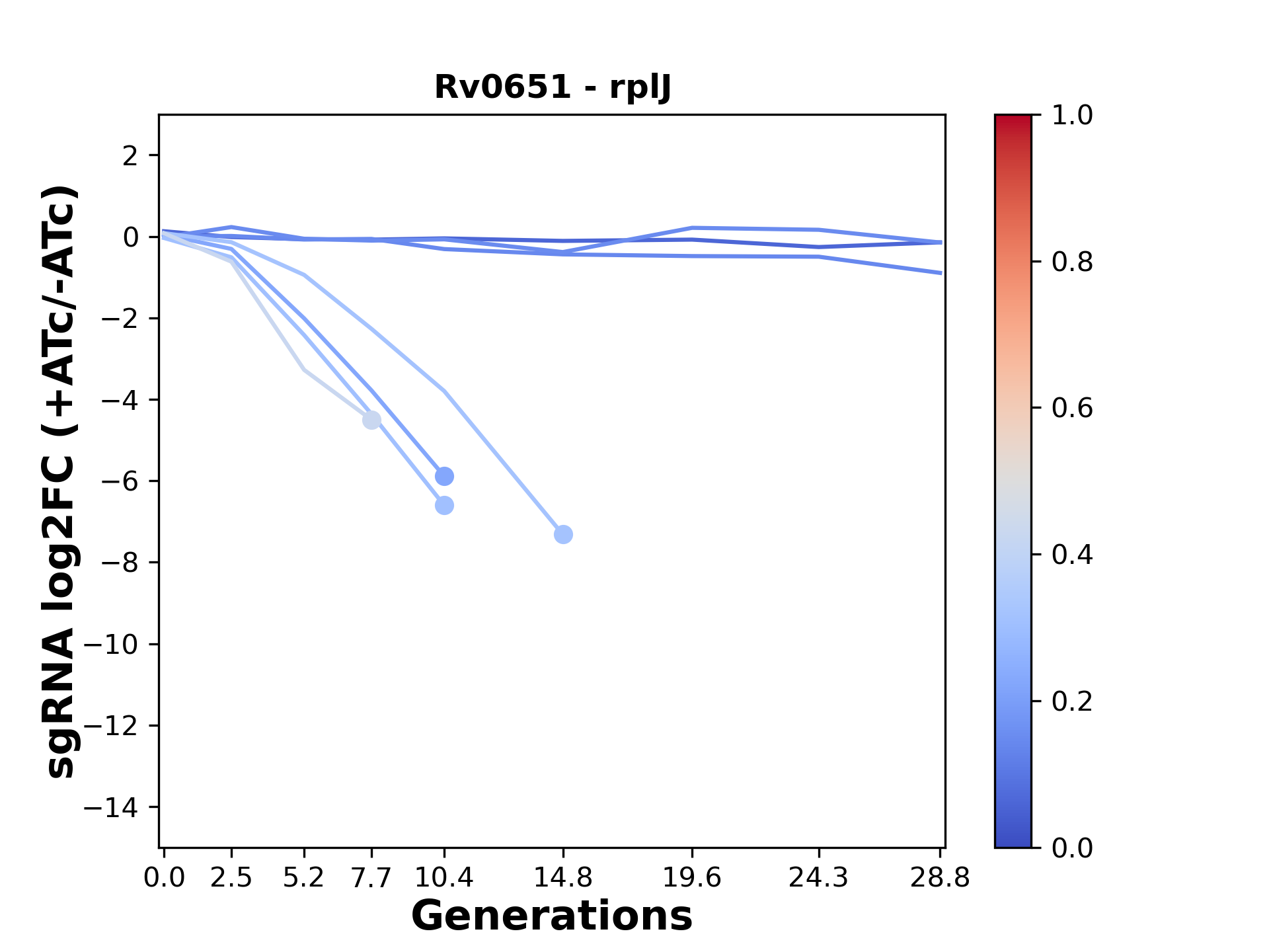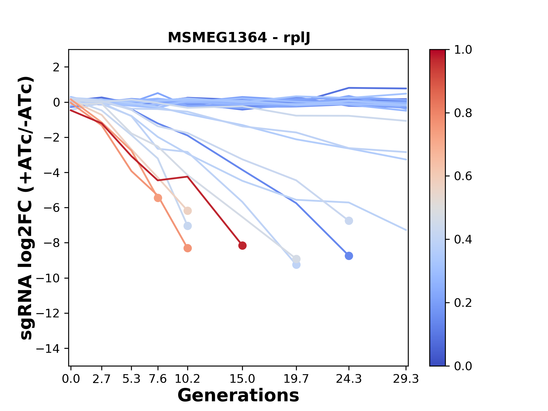 Here, we show sgRNA log2 fold-change values (L2FC) (plus versus minus ATc) over consecutive generations for sgRNAs targeting the gene you selected.