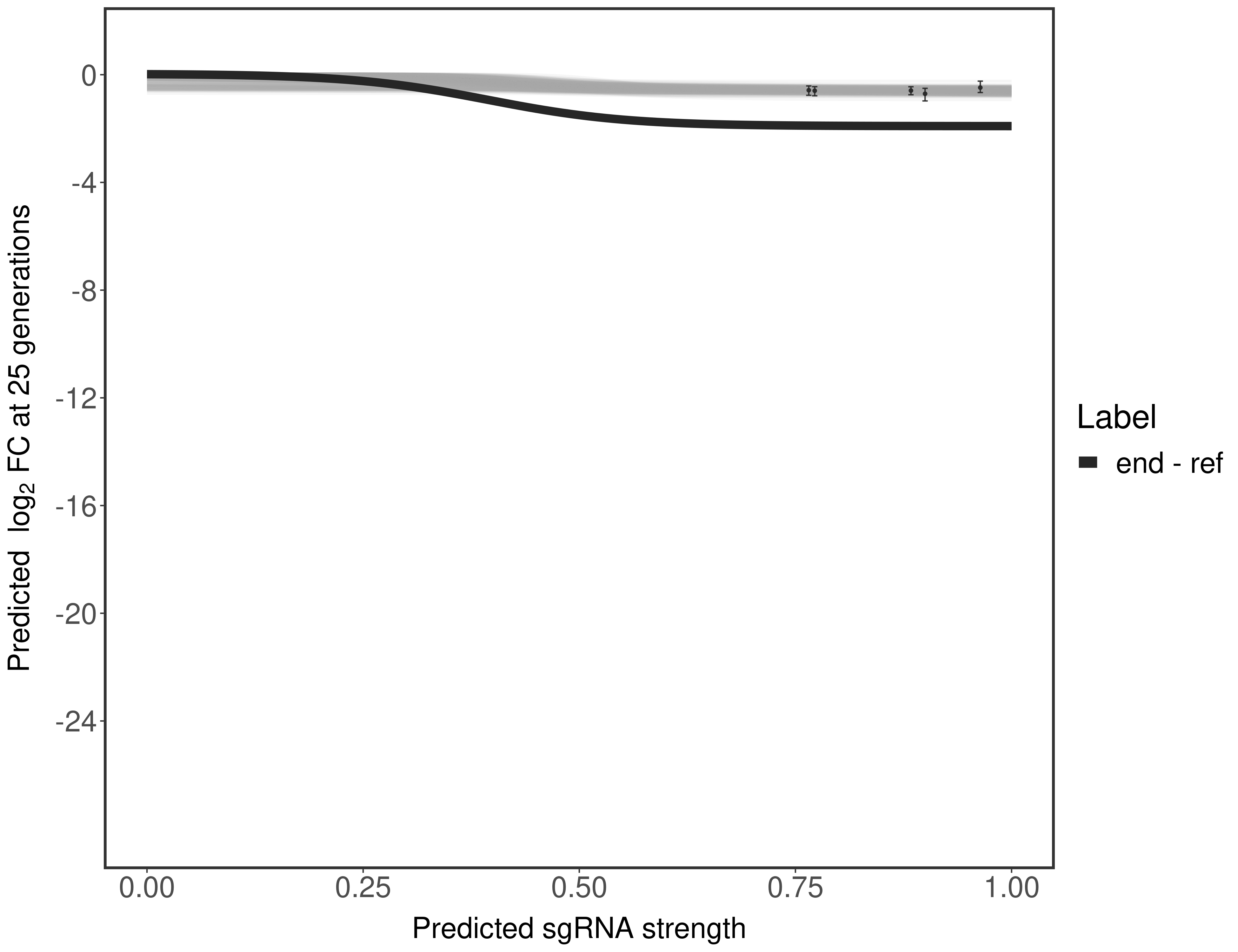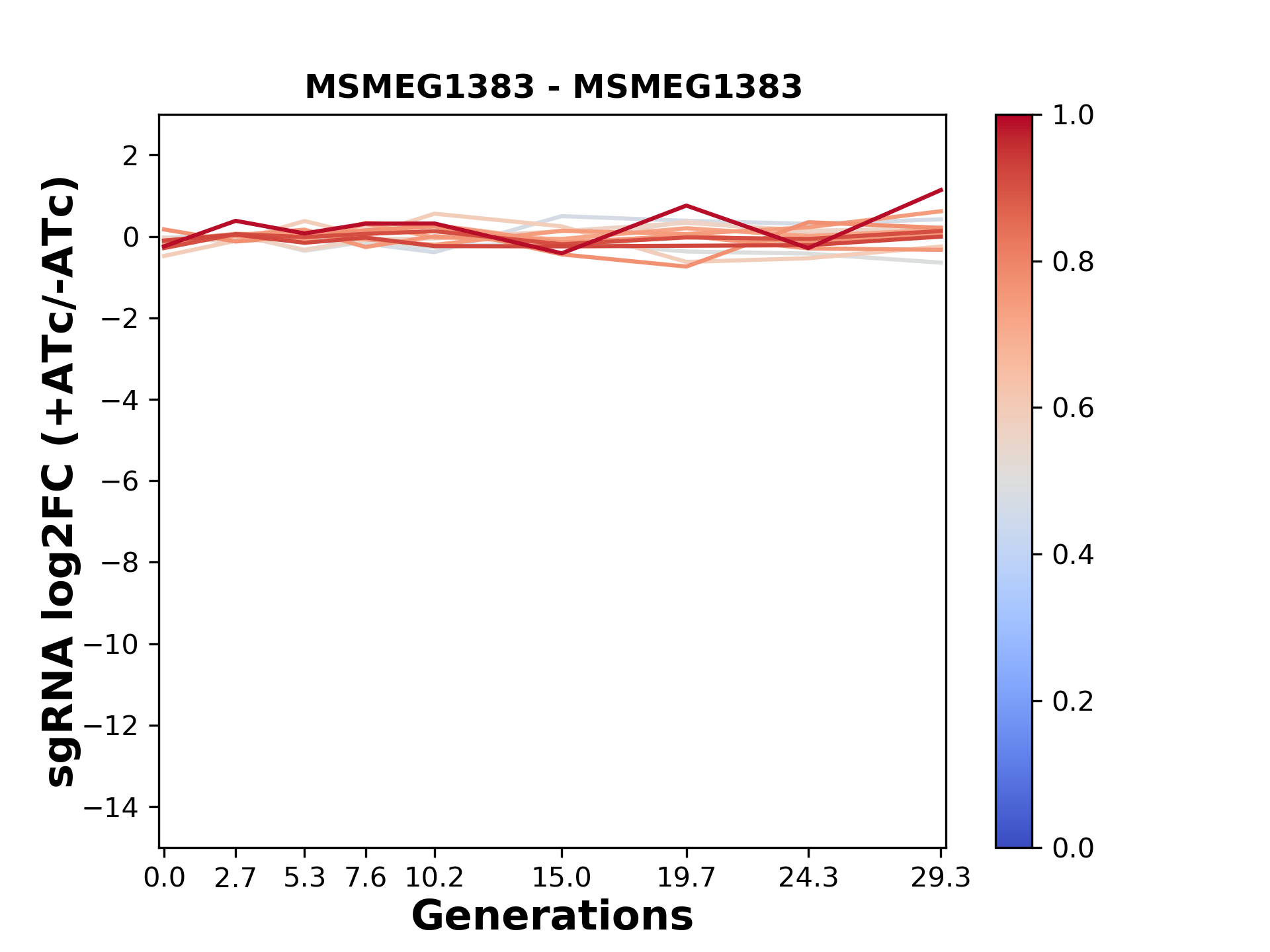 Here, we show sgRNA log2 fold-change values (L2FC) (plus versus minus ATc) over consecutive generations for sgRNAs targeting the gene you selected.