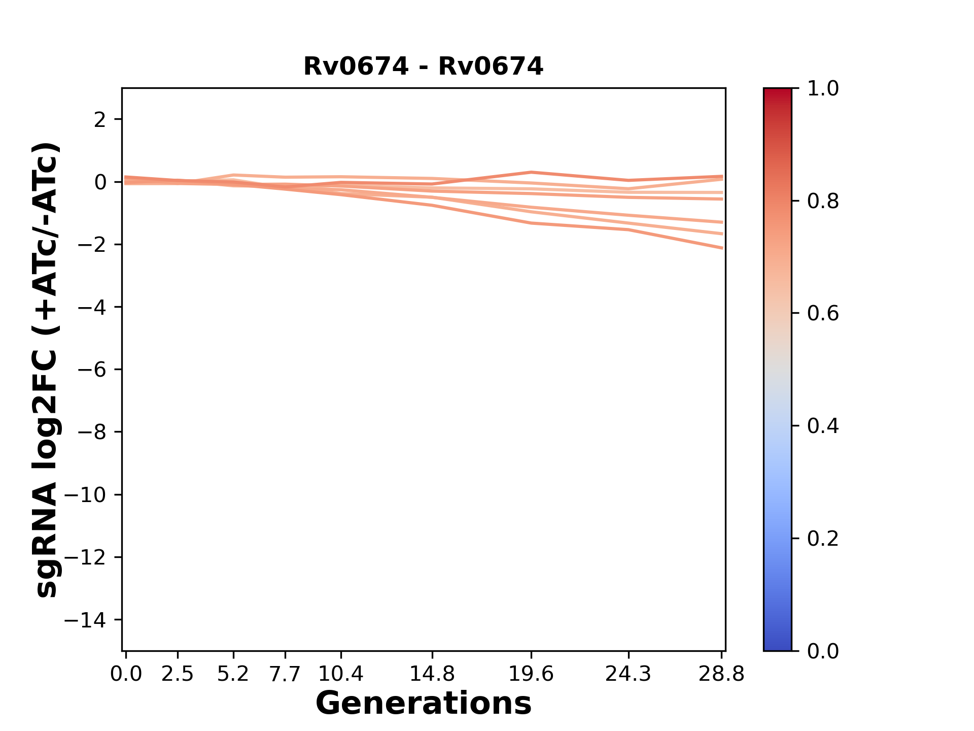 Here, we show sgRNA log2 fold-change values (L2FC) (plus versus minus ATc) over consecutive generations for sgRNAs targeting the gene you selected.