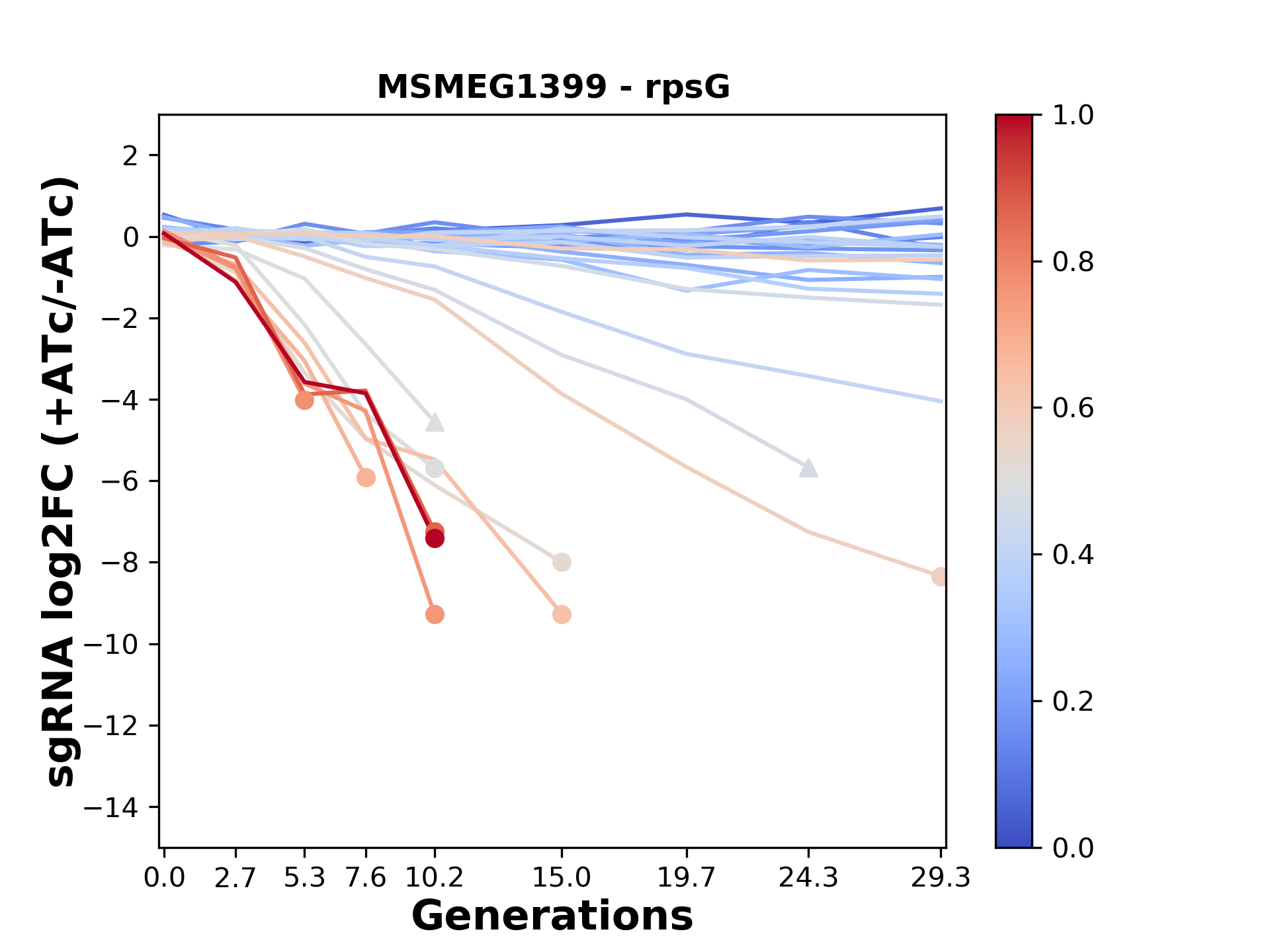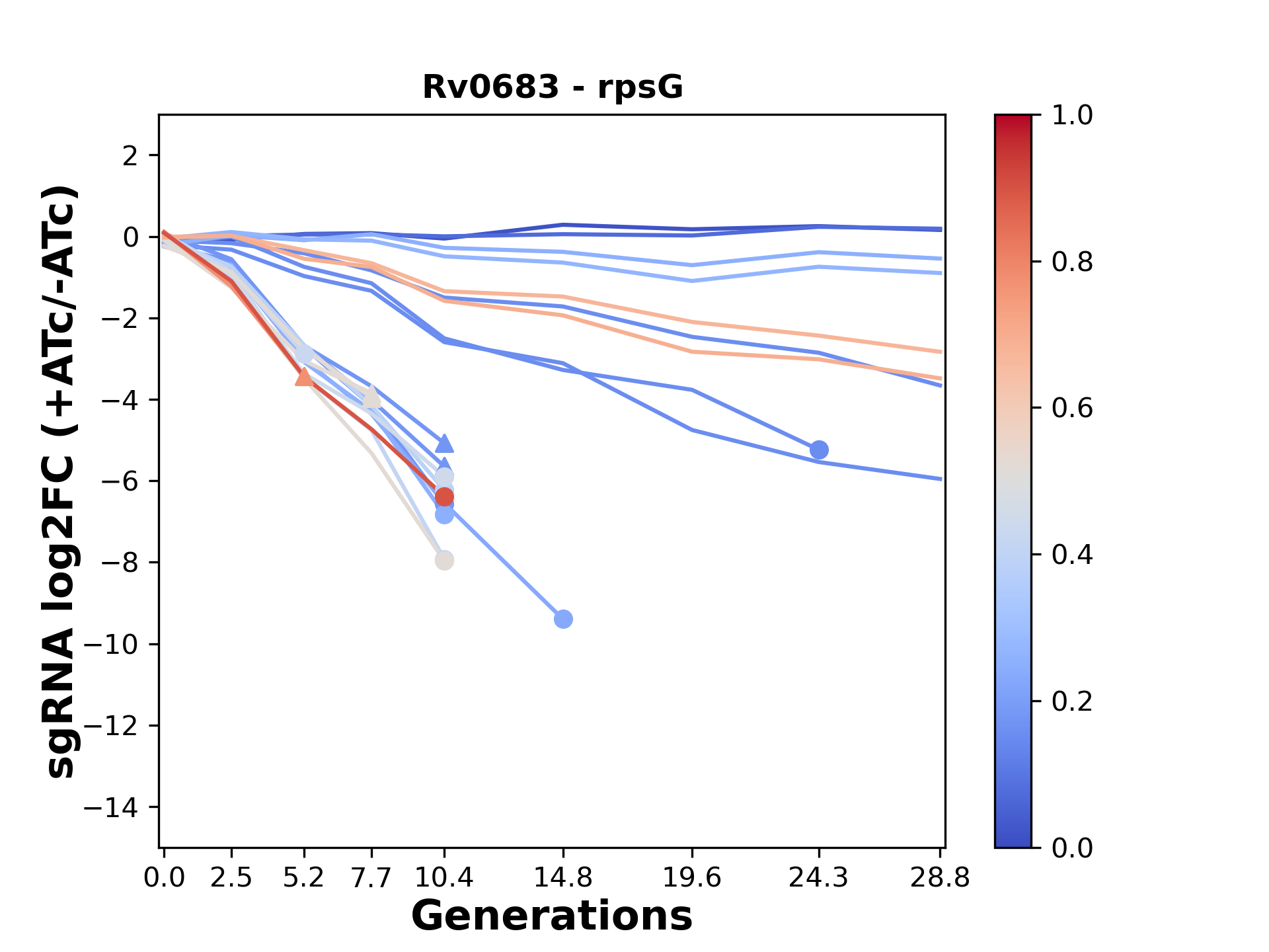 Here, we show sgRNA log2 fold-change values (L2FC) (plus versus minus ATc) over consecutive generations for sgRNAs targeting the gene you selected.