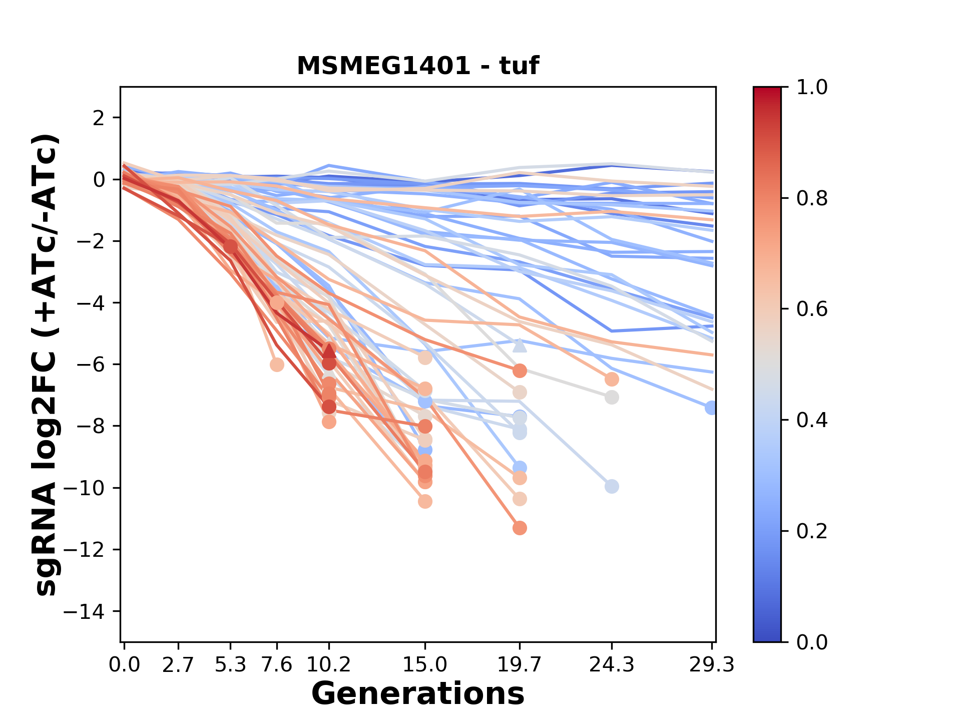 Here, we show sgRNA log2 fold-change values (L2FC) (plus versus minus ATc) over consecutive generations for sgRNAs targeting the gene you selected.