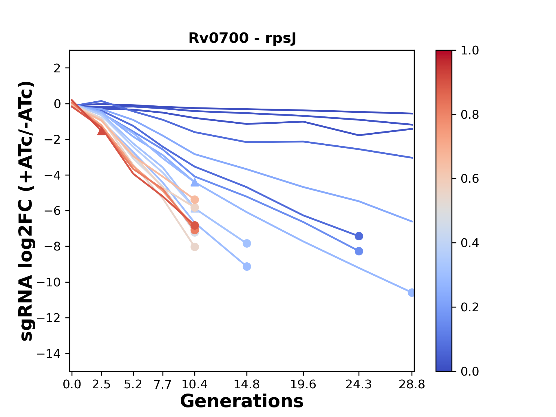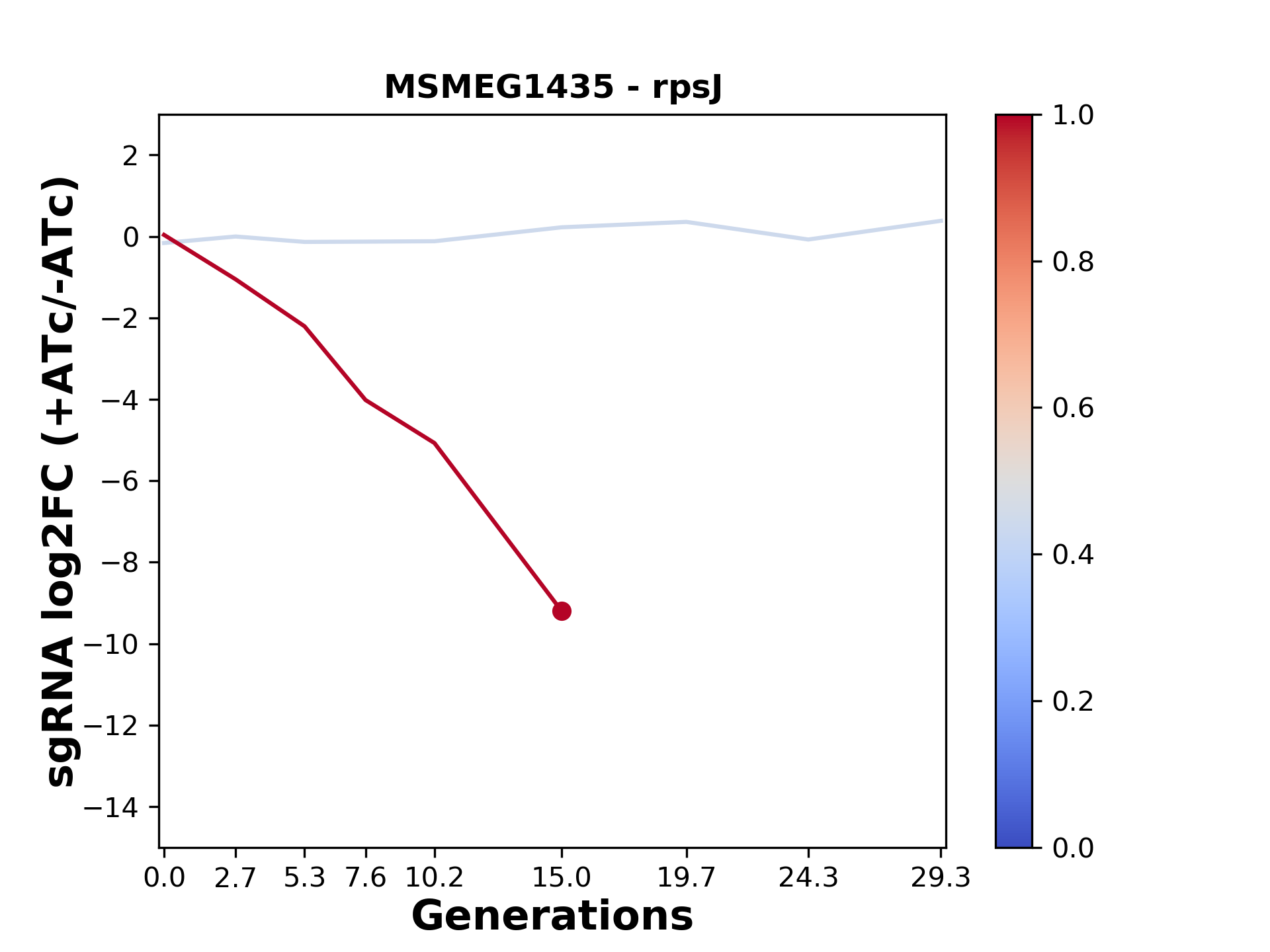 Here, we show sgRNA log2 fold-change values (L2FC) (plus versus minus ATc) over consecutive generations for sgRNAs targeting the gene you selected.