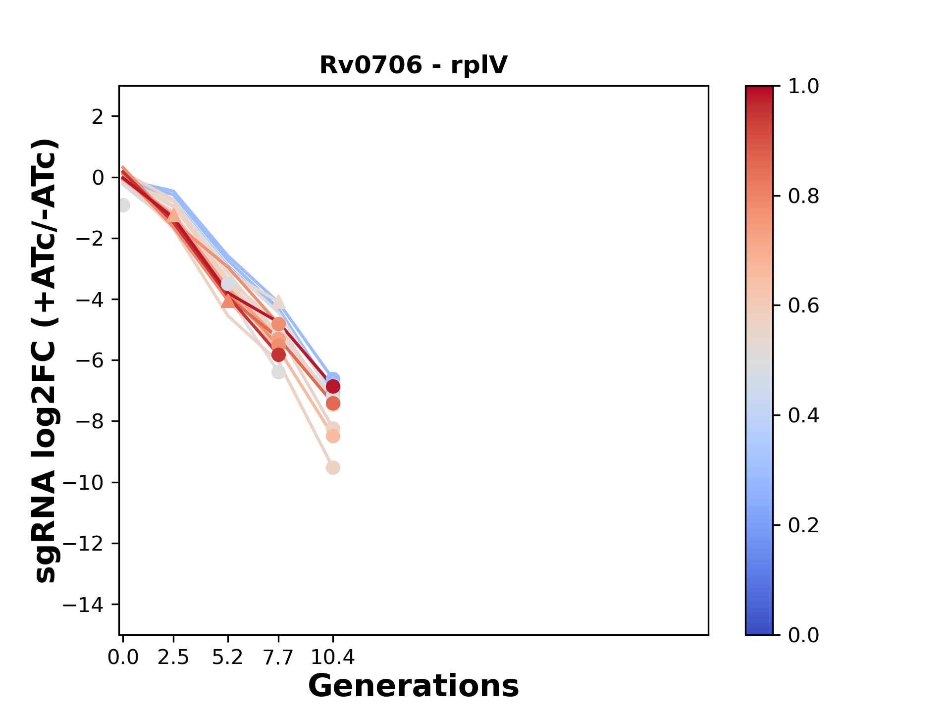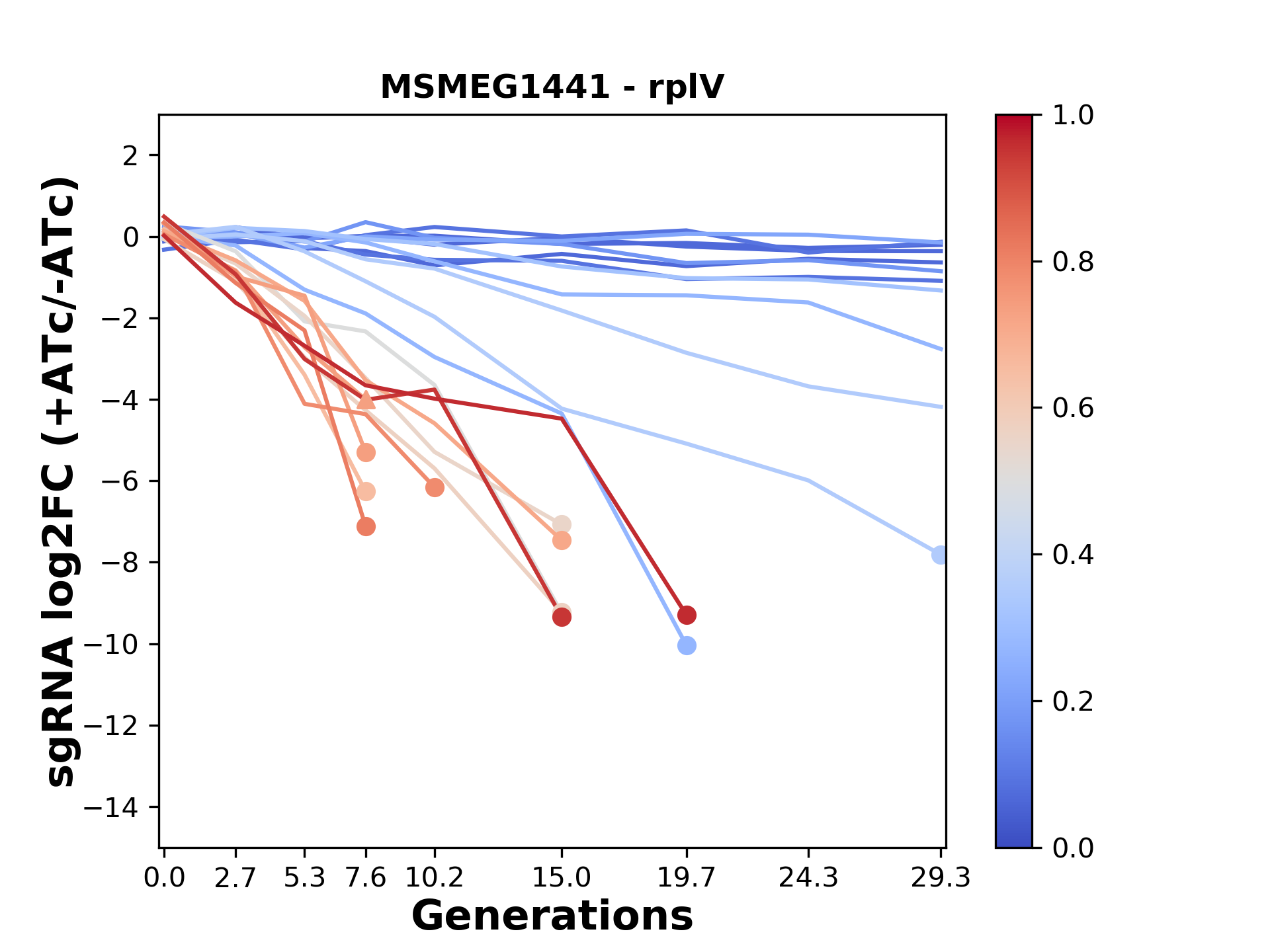 Here, we show sgRNA log2 fold-change values (L2FC) (plus versus minus ATc) over consecutive generations for sgRNAs targeting the gene you selected.