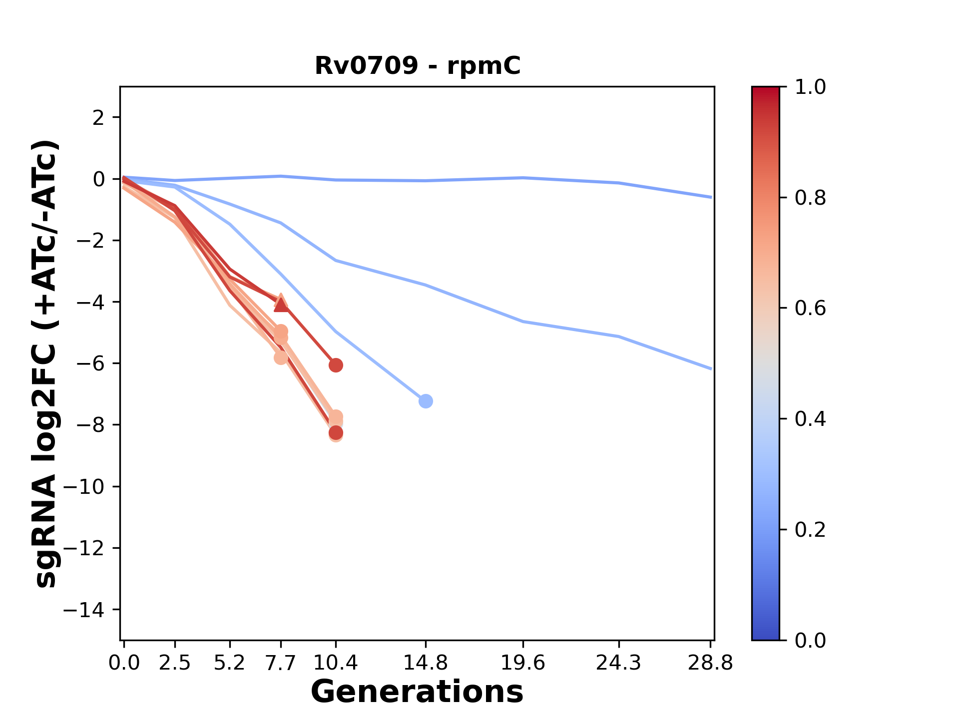 Here, we show sgRNA log2 fold-change values (L2FC) (plus versus minus ATc) over consecutive generations for sgRNAs targeting the gene you selected.
