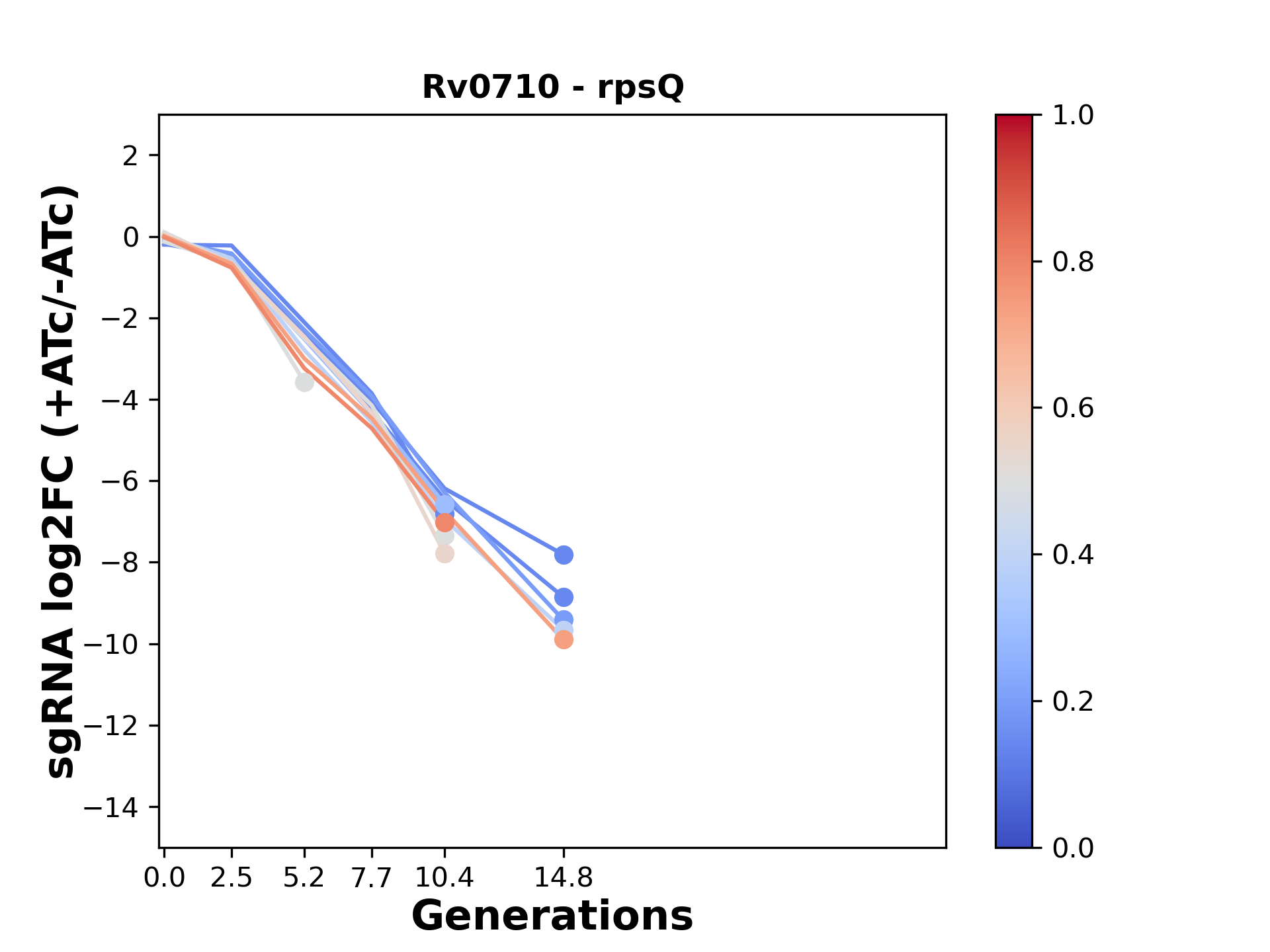 Here, we show sgRNA log2 fold-change values (L2FC) (plus versus minus ATc) over consecutive generations for sgRNAs targeting the gene you selected.