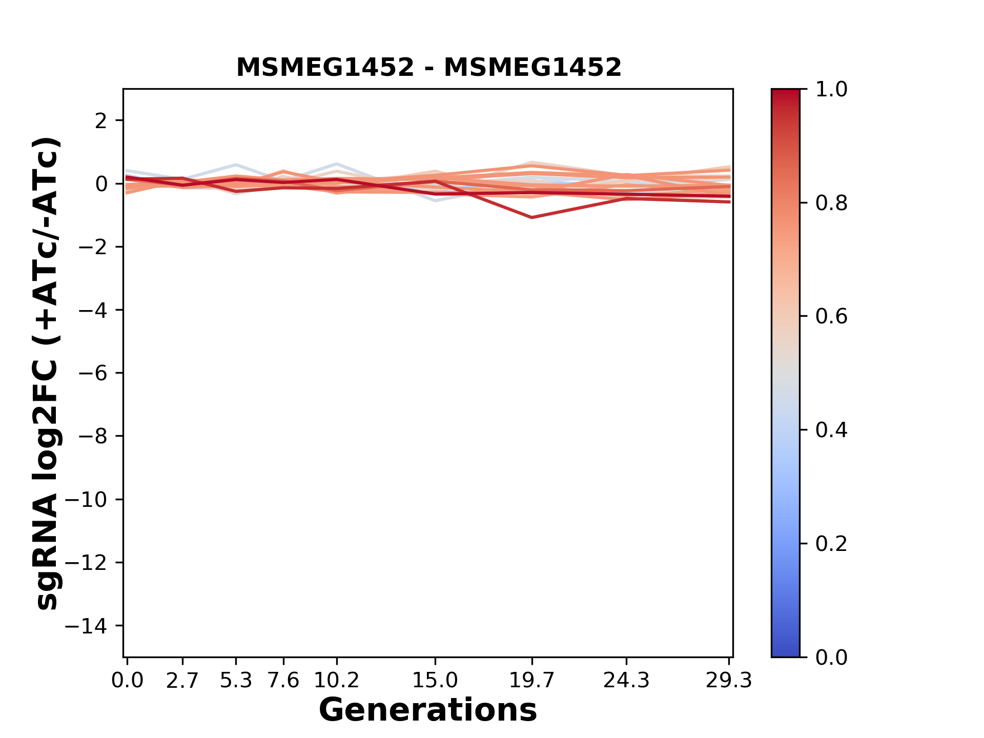 Here, we show sgRNA log2 fold-change values (L2FC) (plus versus minus ATc) over consecutive generations for sgRNAs targeting the gene you selected.