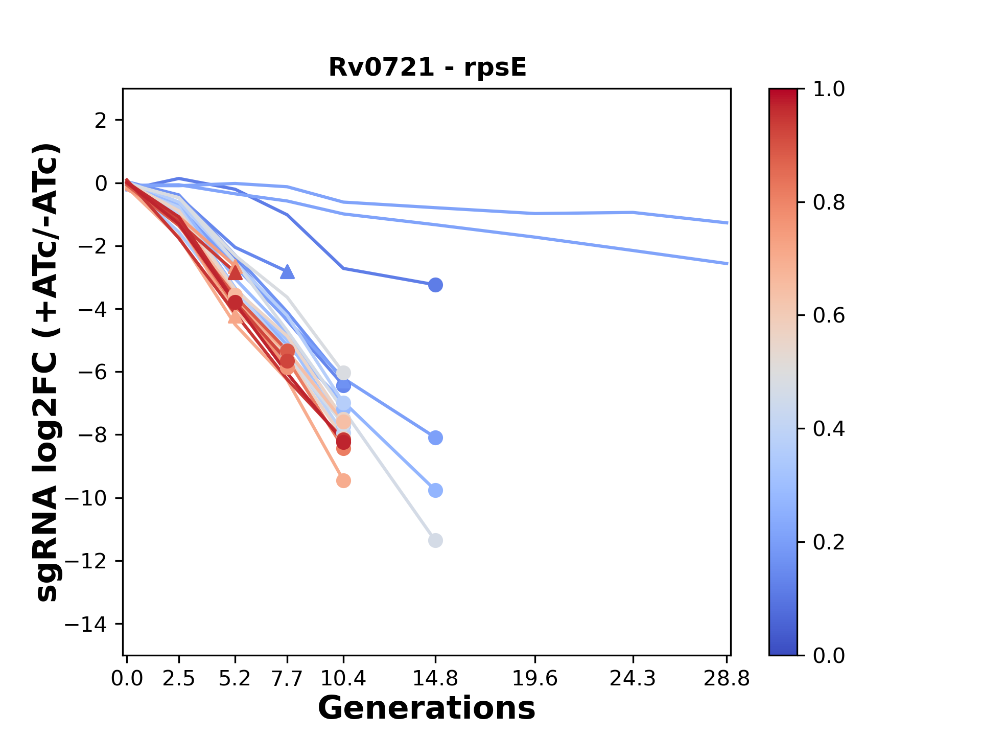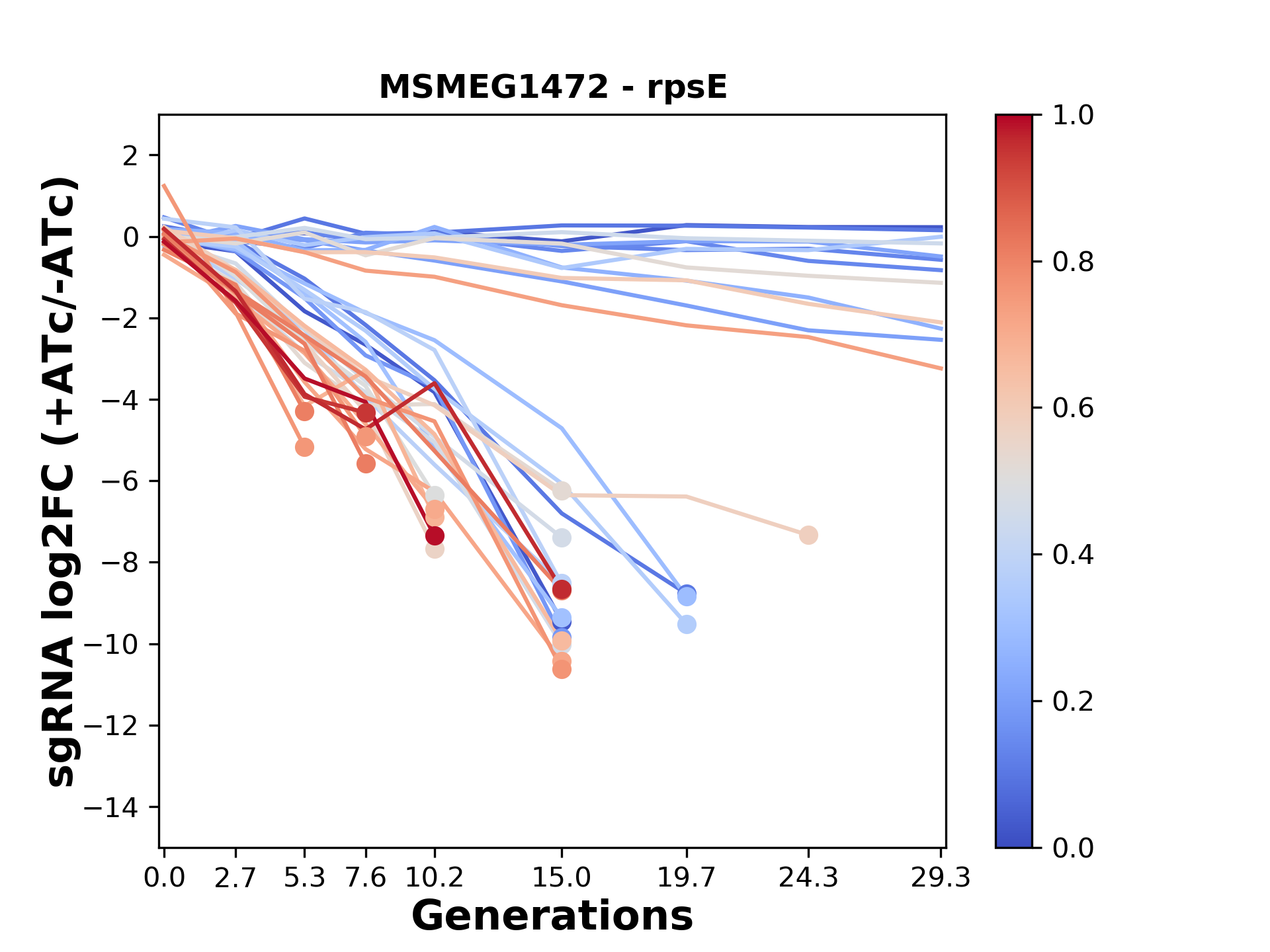 Here, we show sgRNA log2 fold-change values (L2FC) (plus versus minus ATc) over consecutive generations for sgRNAs targeting the gene you selected.