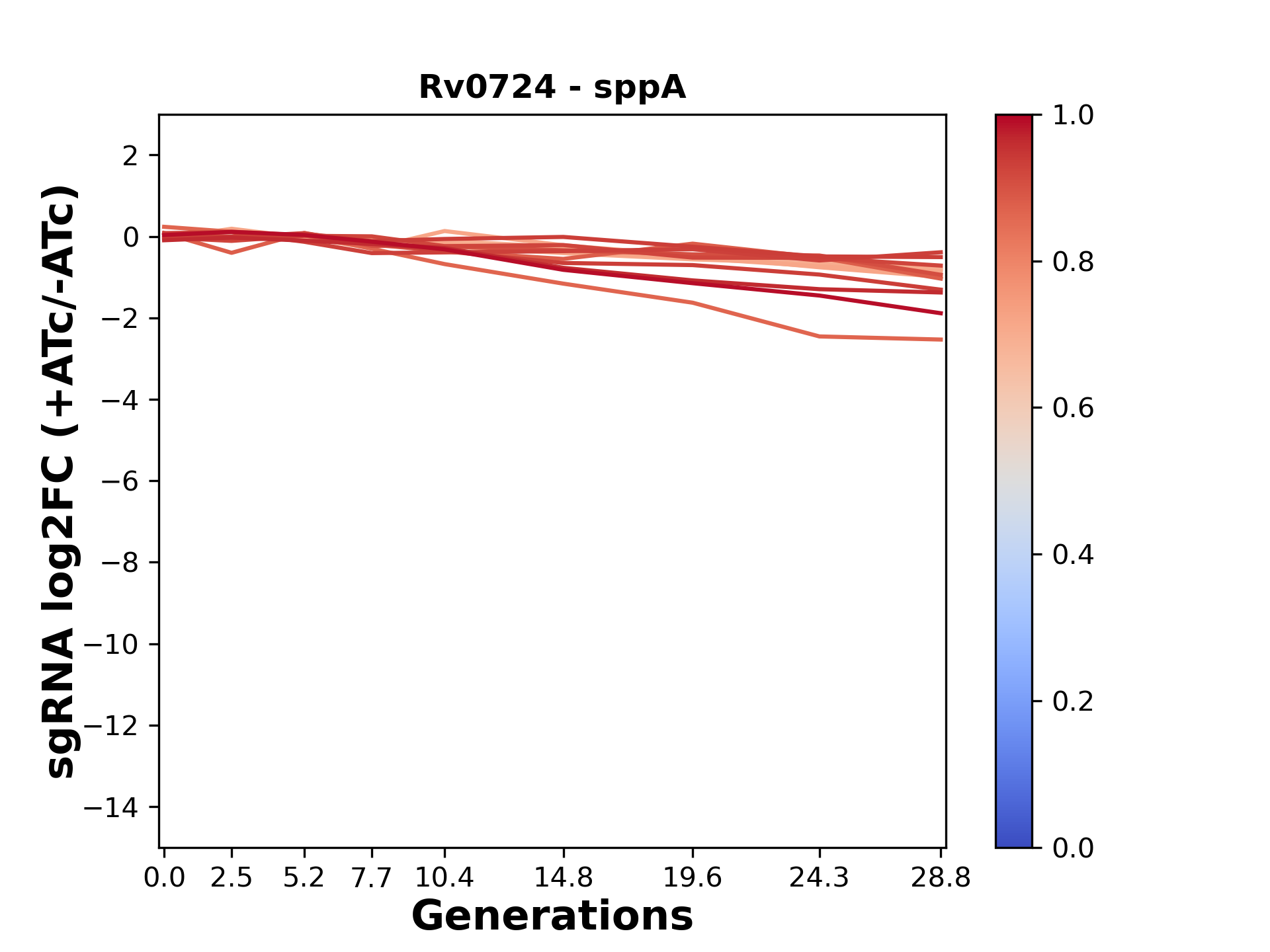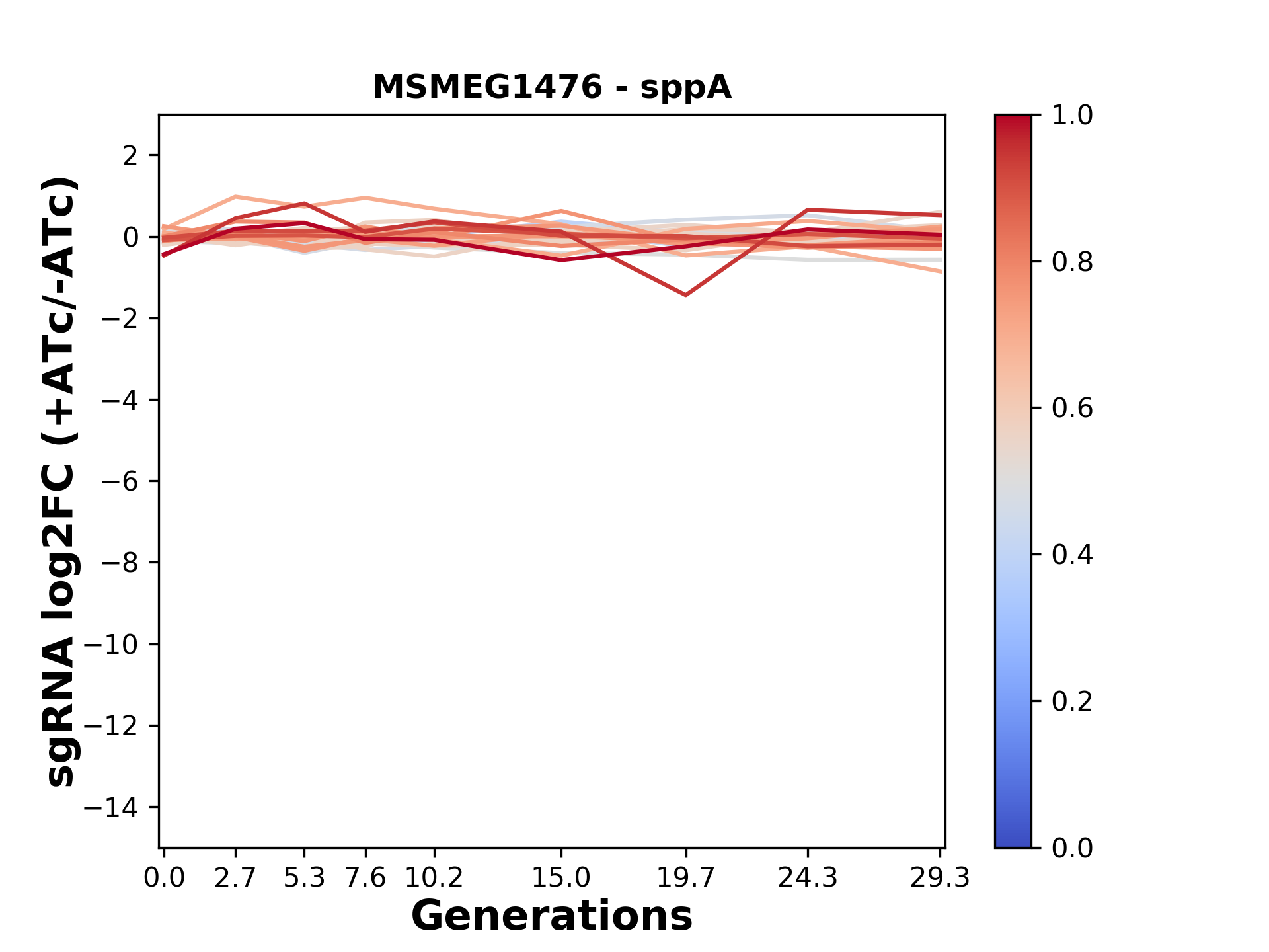 Here, we show sgRNA log2 fold-change values (L2FC) (plus versus minus ATc) over consecutive generations for sgRNAs targeting the gene you selected.
