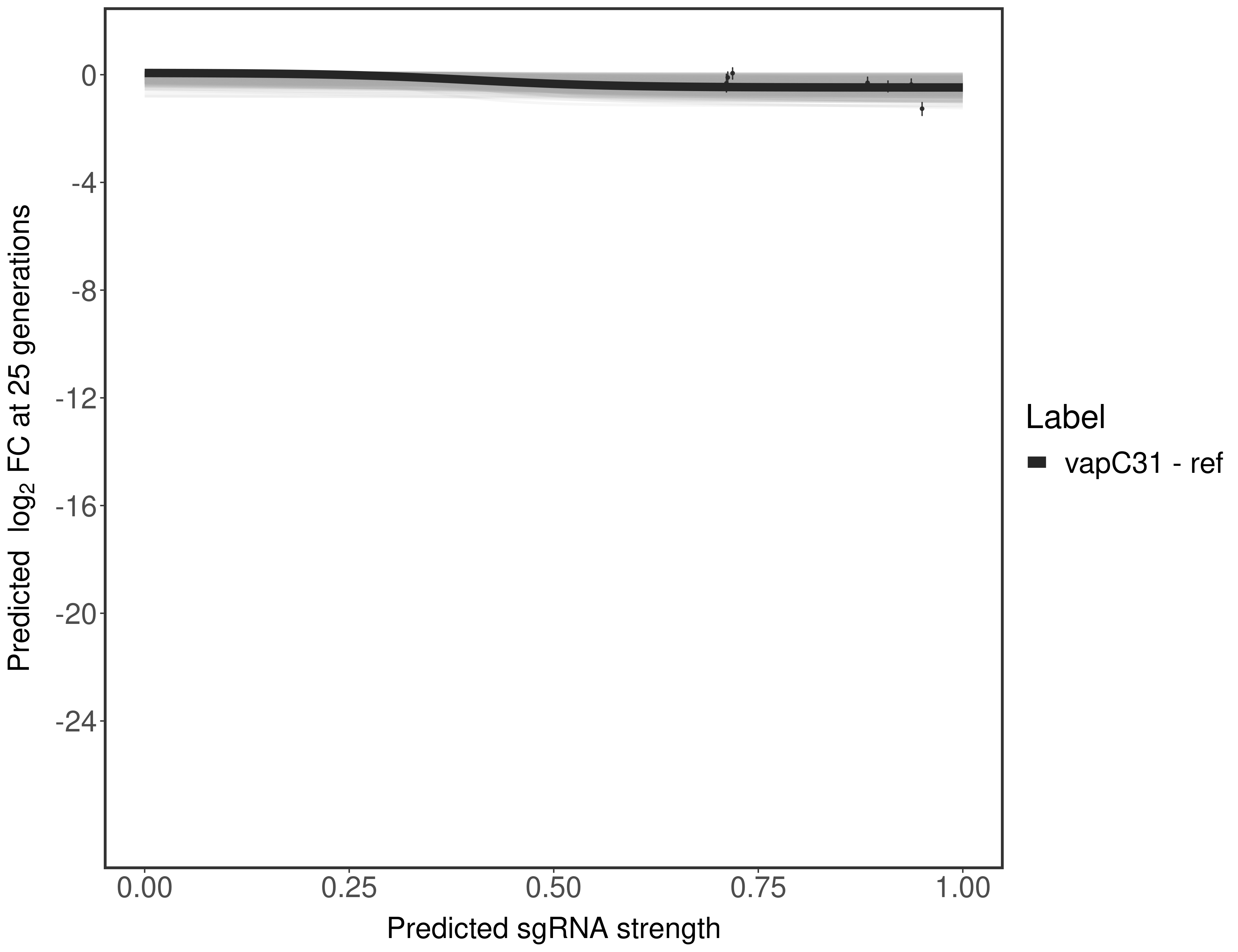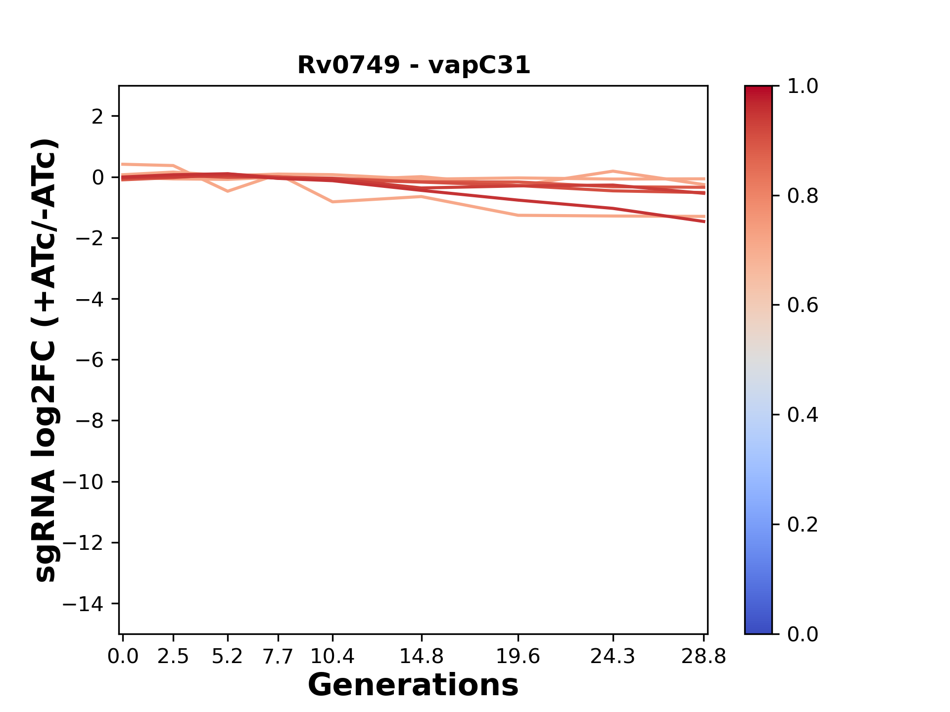 Here, we show sgRNA log2 fold-change values (L2FC) (plus versus minus ATc) over consecutive generations for sgRNAs targeting the gene you selected.