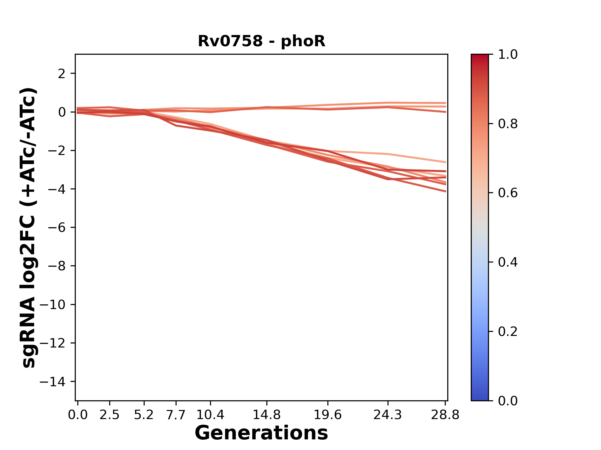 Here, we show sgRNA log2 fold-change values (L2FC) (plus versus minus ATc) over consecutive generations for sgRNAs targeting the gene you selected.