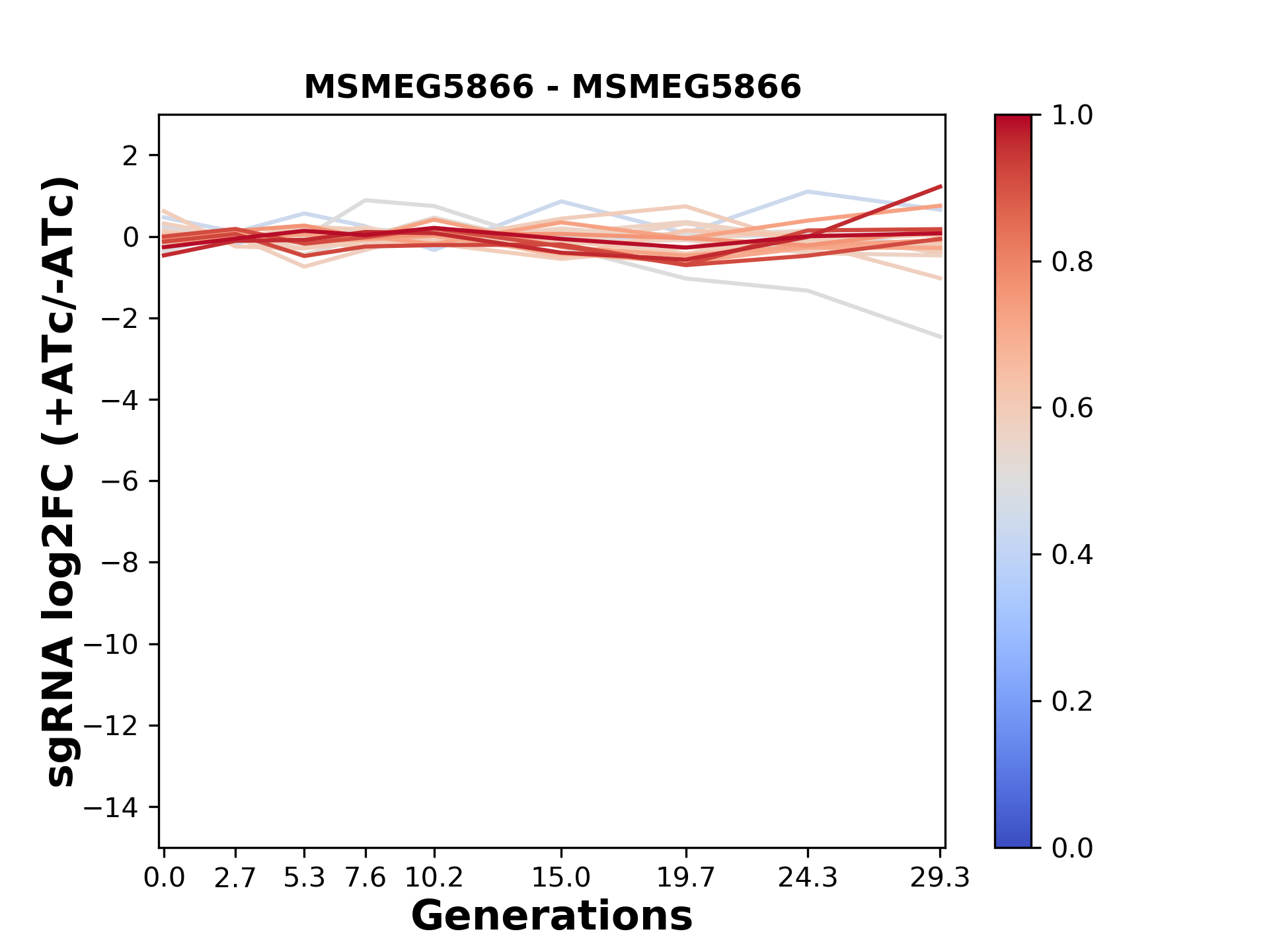 Here, we show sgRNA log2 fold-change values (L2FC) (plus versus minus ATc) over consecutive generations for sgRNAs targeting the gene you selected.