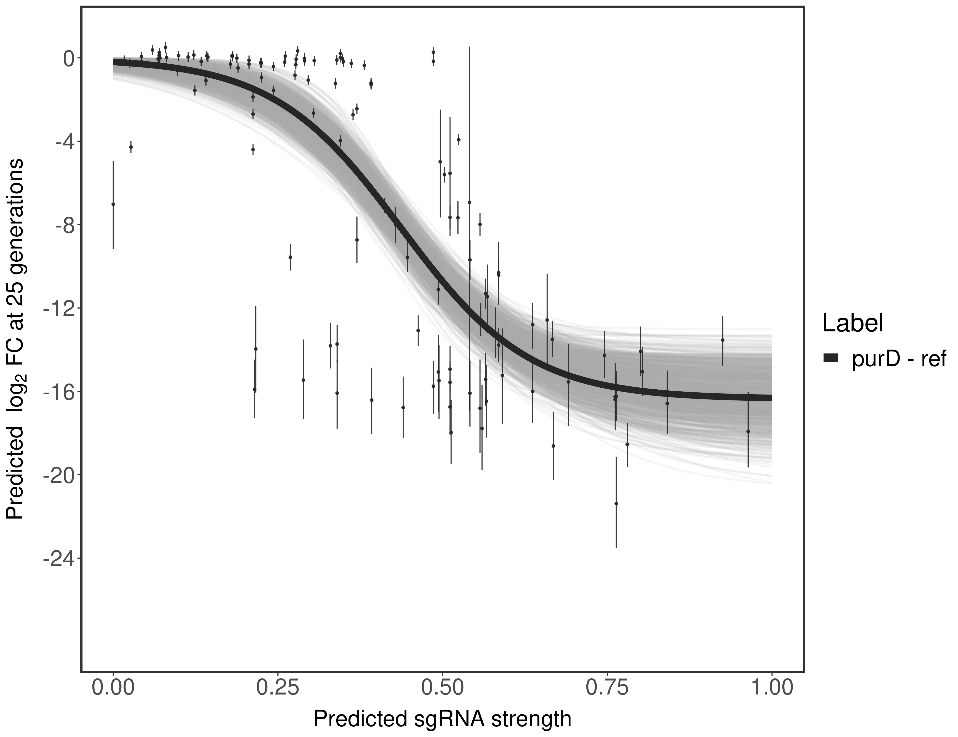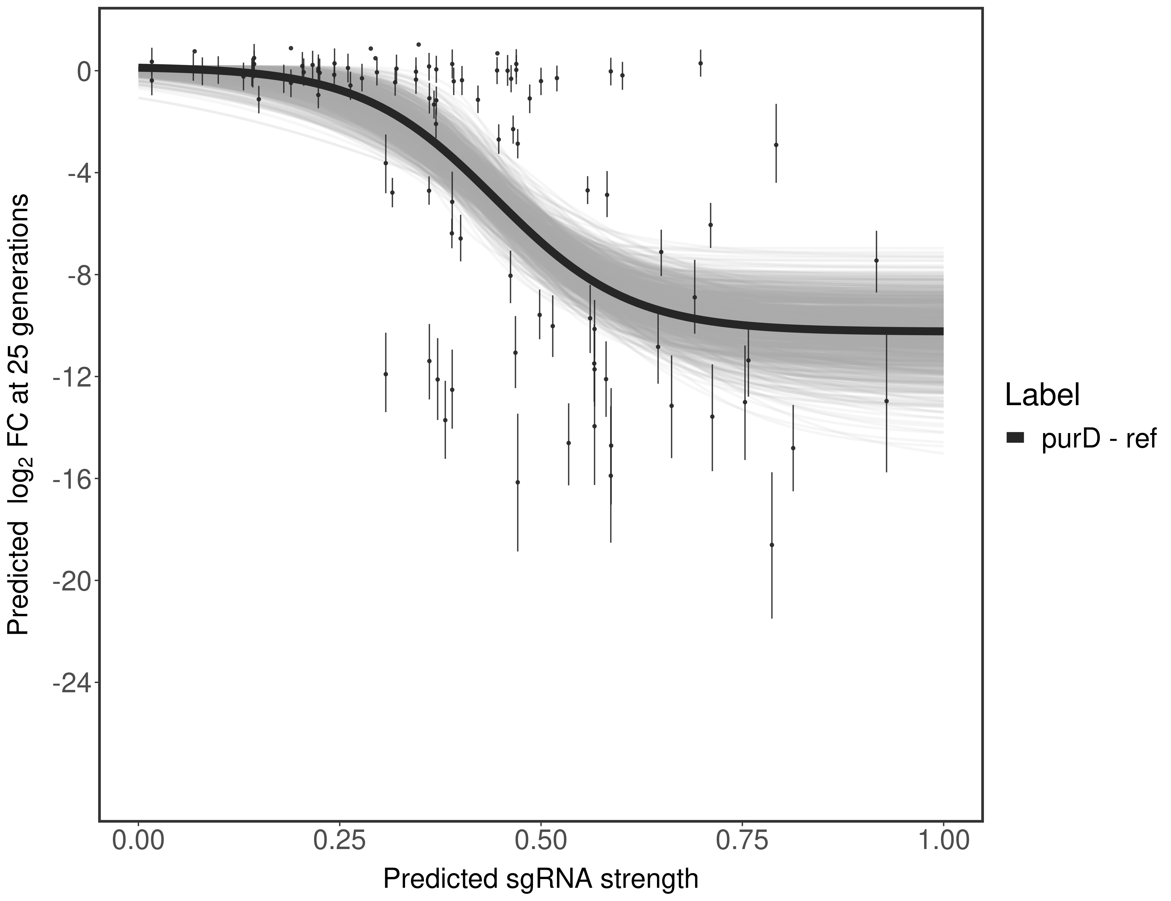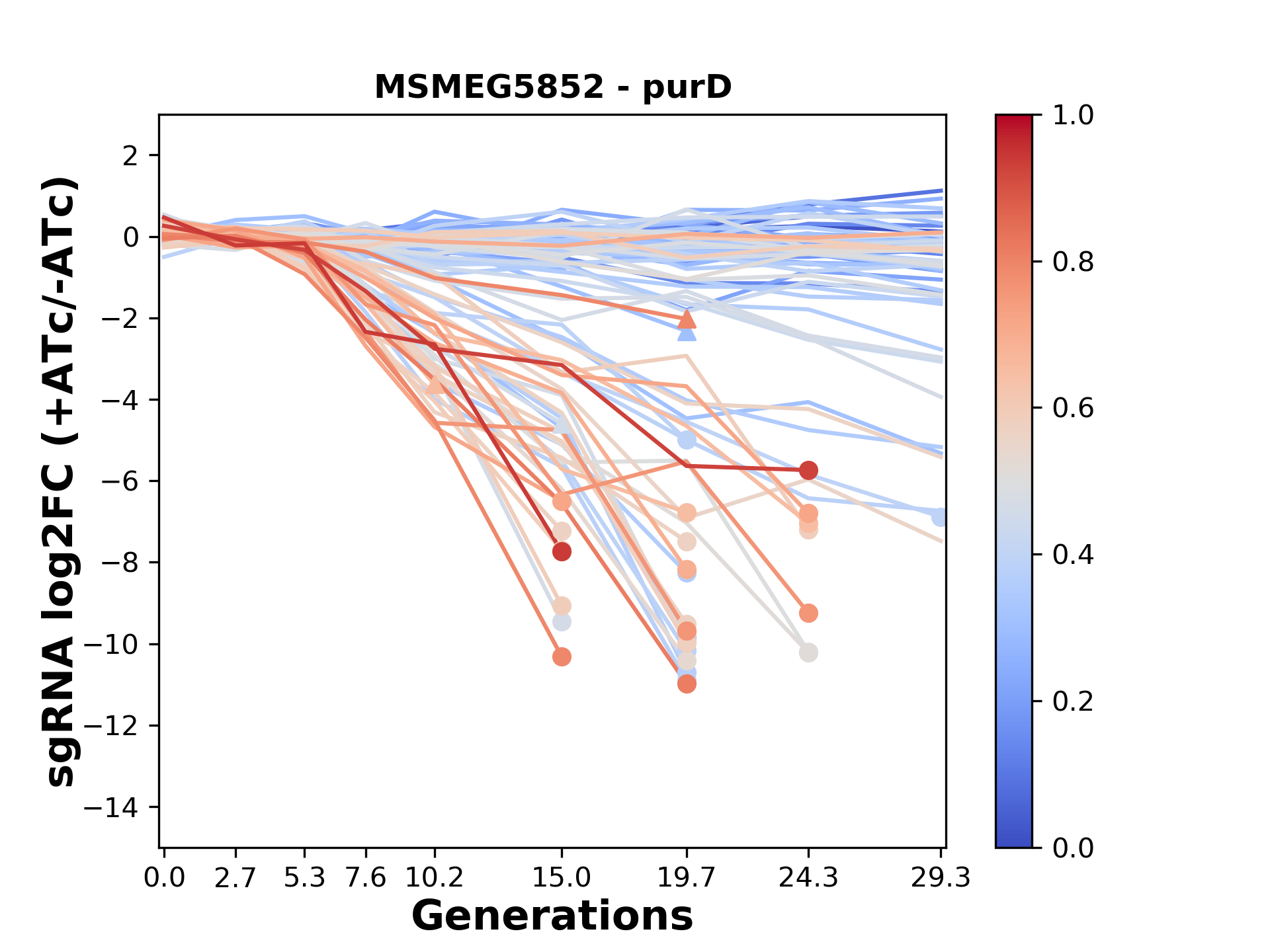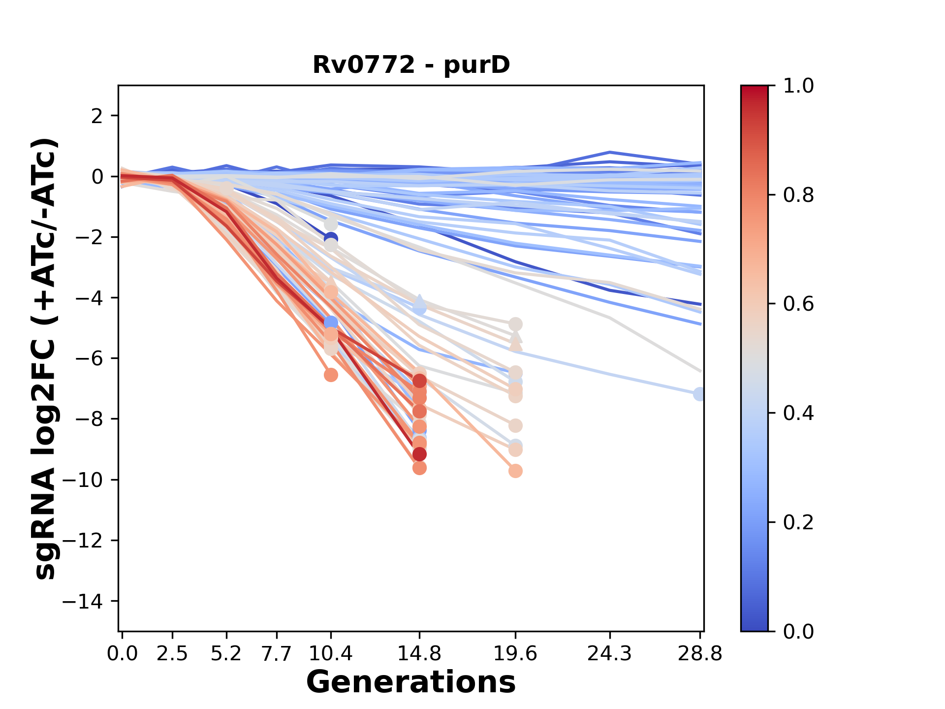 Experiment: We designed an M. tuberculosis CRISPRi library (RLC12) to target all annotated Mtb genes with single guide RNAs (sgRNAs) of varying predicted knockdown efficiencies. In parallel, we constructed a M. smegmatis CRISPRi library (RLC11) to target all annotated Msmeg genes, similar to the Mtb sgRNA library. RLC12 was transformed into M. tuberculosis H37Rv; RLC11 into M. smegmatis mc2-155. We passaged both CRISPRi libraries for nearly 30 generations in the presence or absence of the CRISPRi-inducer anhydrotetracycline (ATc). At the indicated timepoints, genomic DNA was harvested and the representation of individual sgRNAs was counted using Illumina sequencing. Here, we show sgRNA log2 fold-change values (L2FC) (plus versus minus ATc) over consecutive generations for sgRNAs targeting the gene you selected. sgRNAs are color-coded based on their predicted strength from blue (strength=0; weak) to red (strength=1; strong).