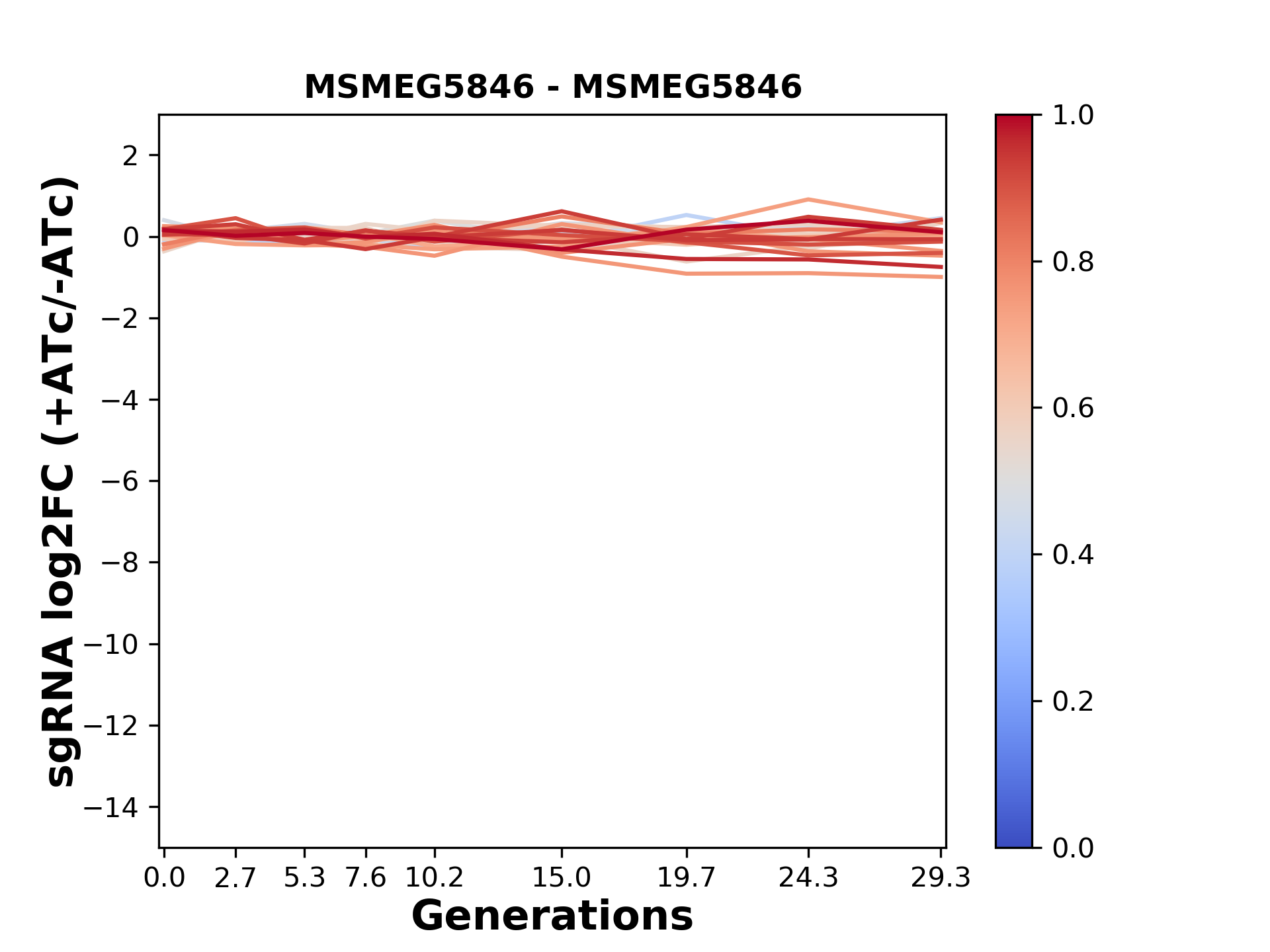 Here, we show sgRNA log2 fold-change values (L2FC) (plus versus minus ATc) over consecutive generations for sgRNAs targeting the gene you selected.