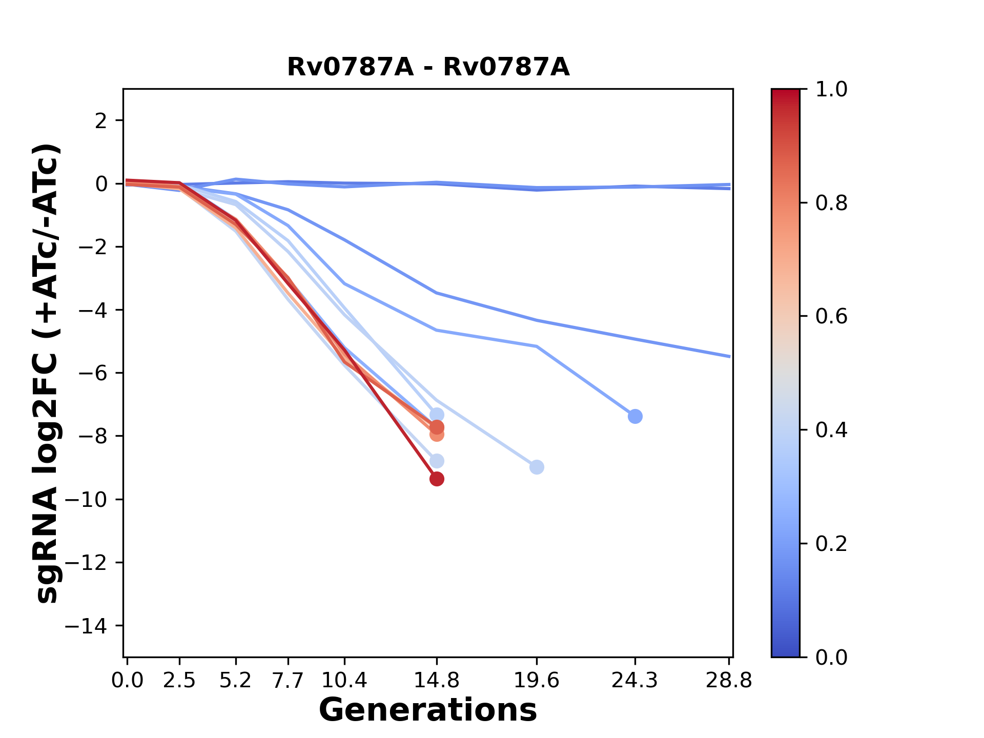 Here, we show sgRNA log2 fold-change values (L2FC) (plus versus minus ATc) over consecutive generations for sgRNAs targeting the gene you selected.