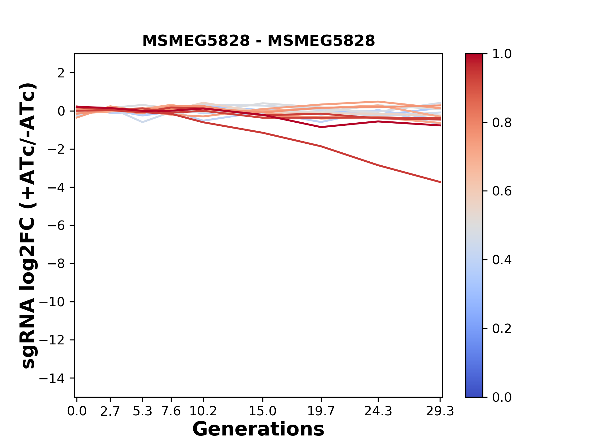 Here, we show sgRNA log2 fold-change values (L2FC) (plus versus minus ATc) over consecutive generations for sgRNAs targeting the gene you selected.