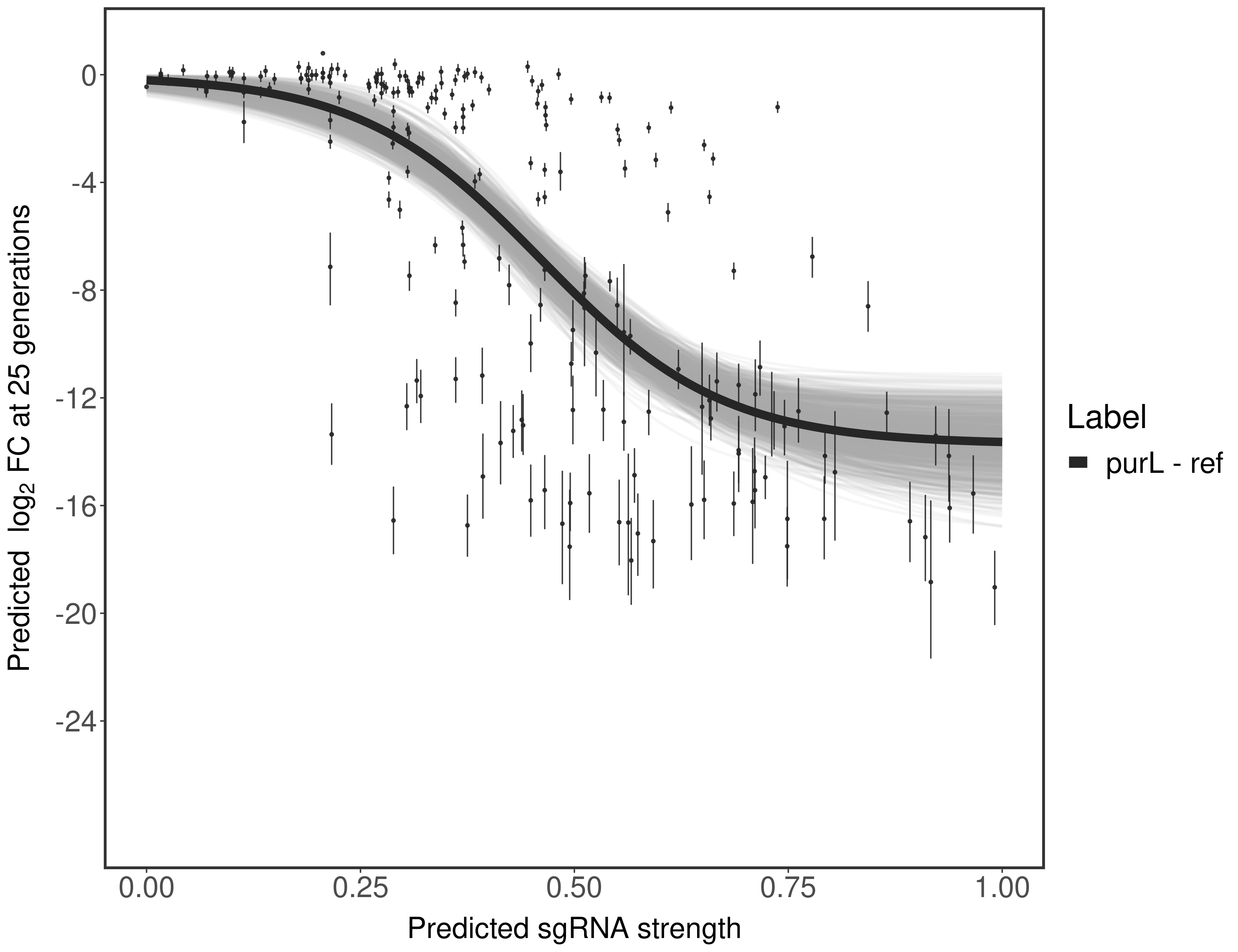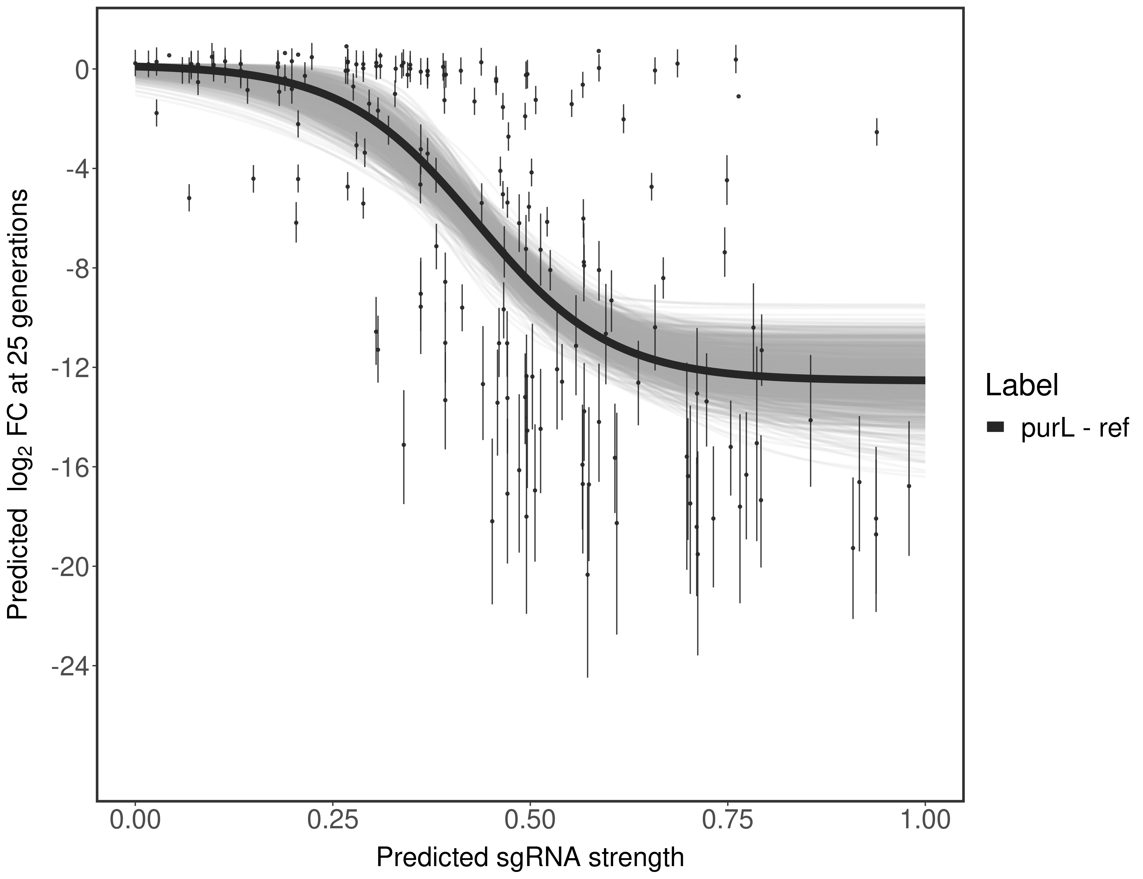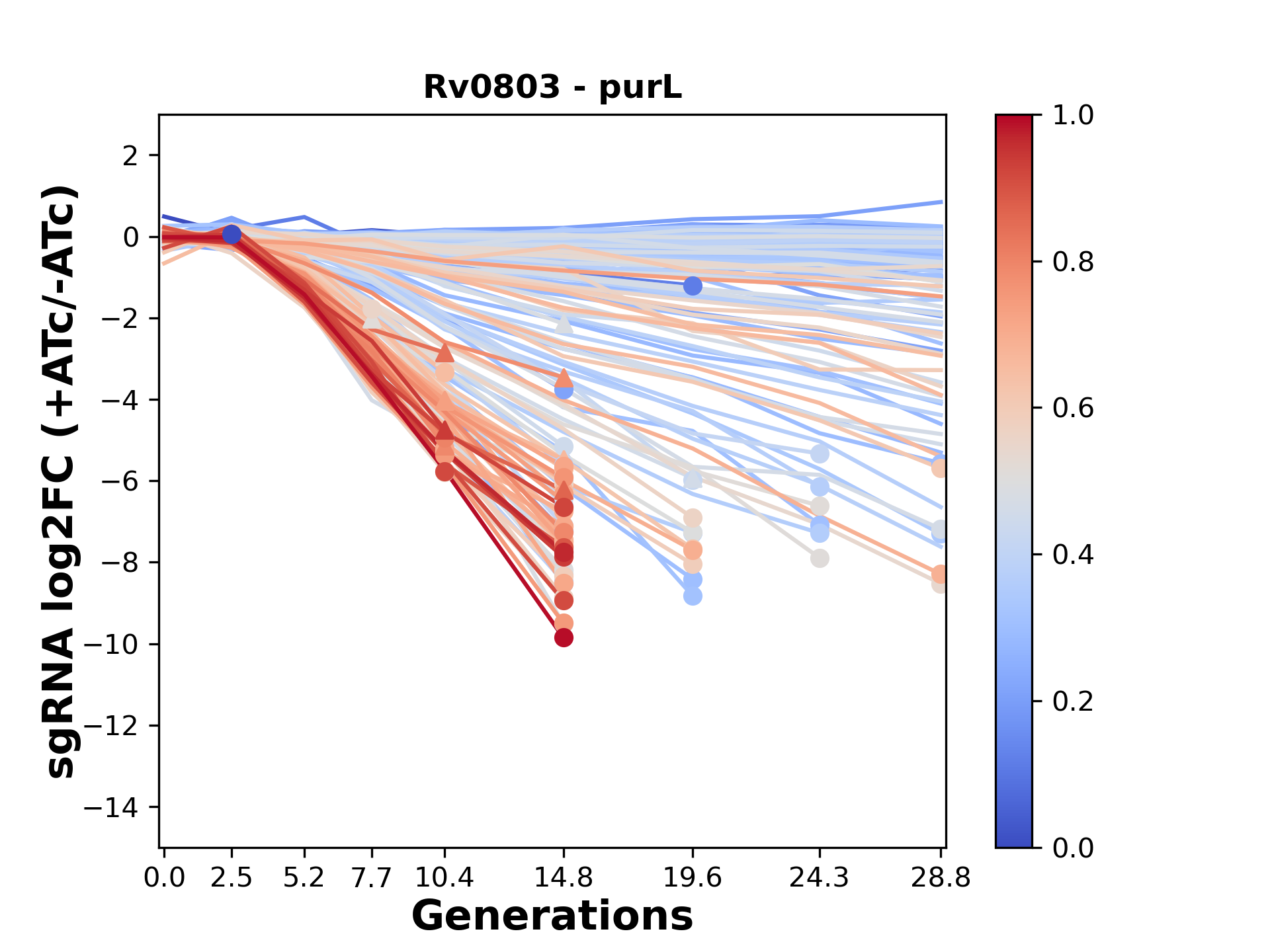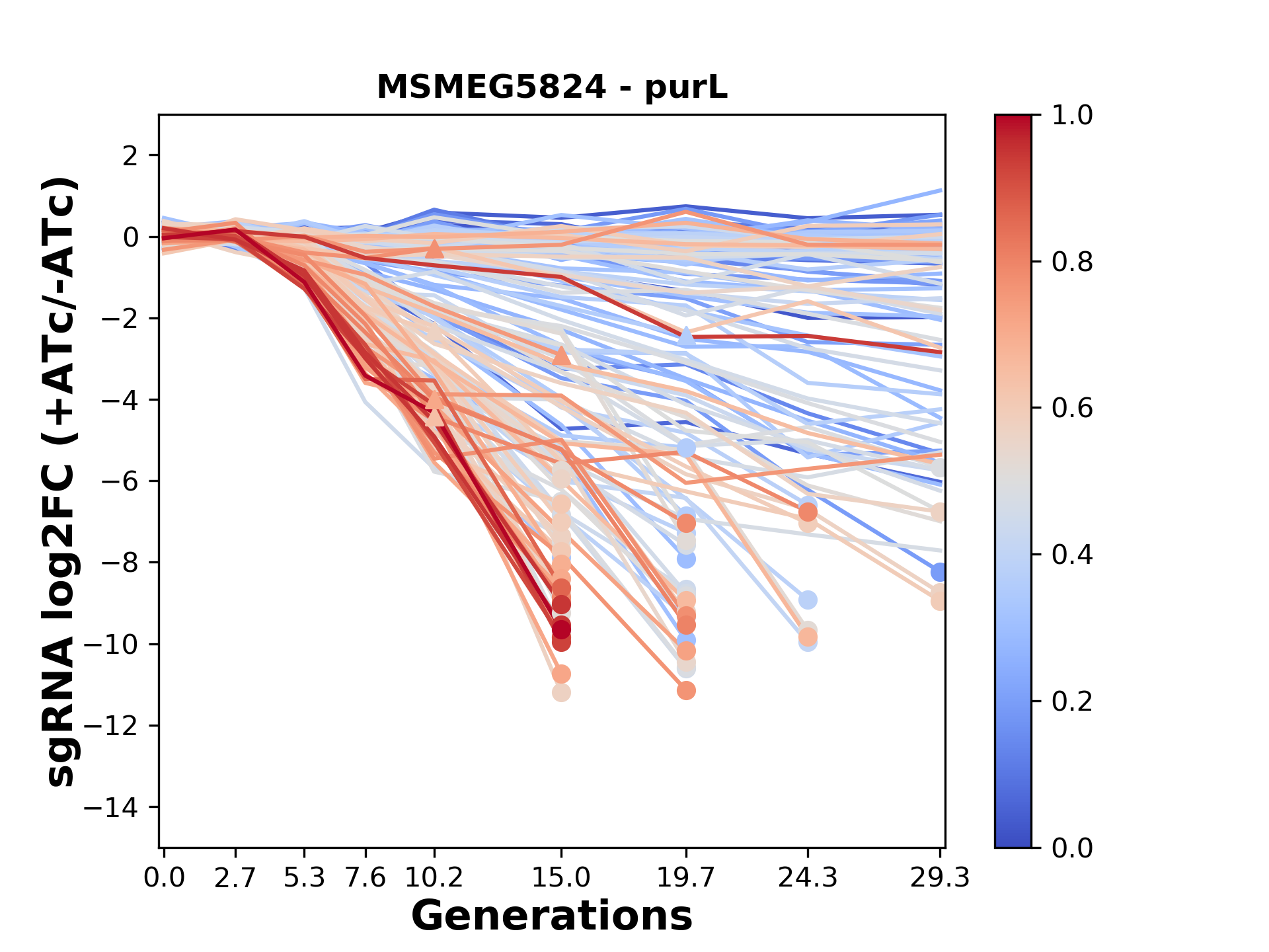 Here, we show sgRNA log2 fold-change values (L2FC) (plus versus minus ATc) over consecutive generations for sgRNAs targeting the gene you selected.