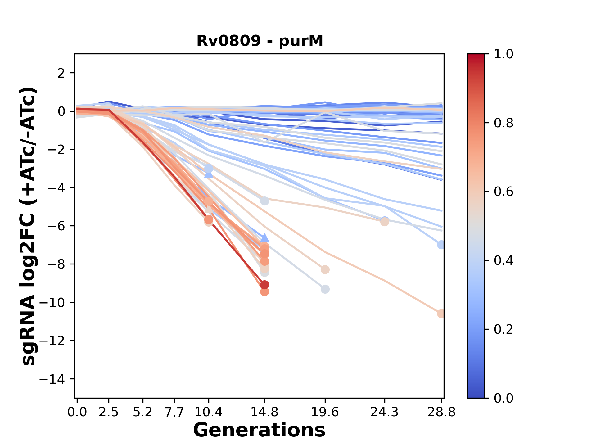 Here, we show sgRNA log2 fold-change values (L2FC) (plus versus minus ATc) over consecutive generations for sgRNAs targeting the gene you selected.