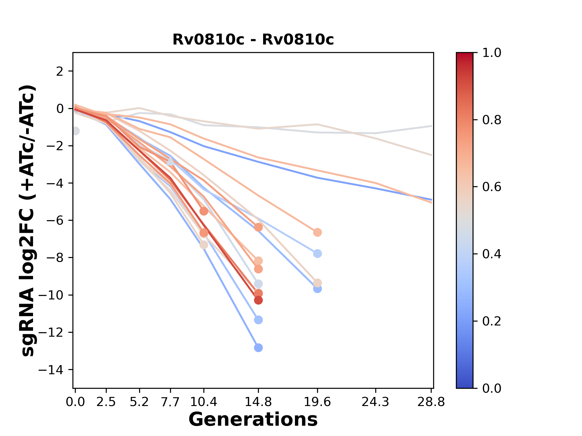 Here, we show sgRNA log2 fold-change values (L2FC) (plus versus minus ATc) over consecutive generations for sgRNAs targeting the gene you selected.
