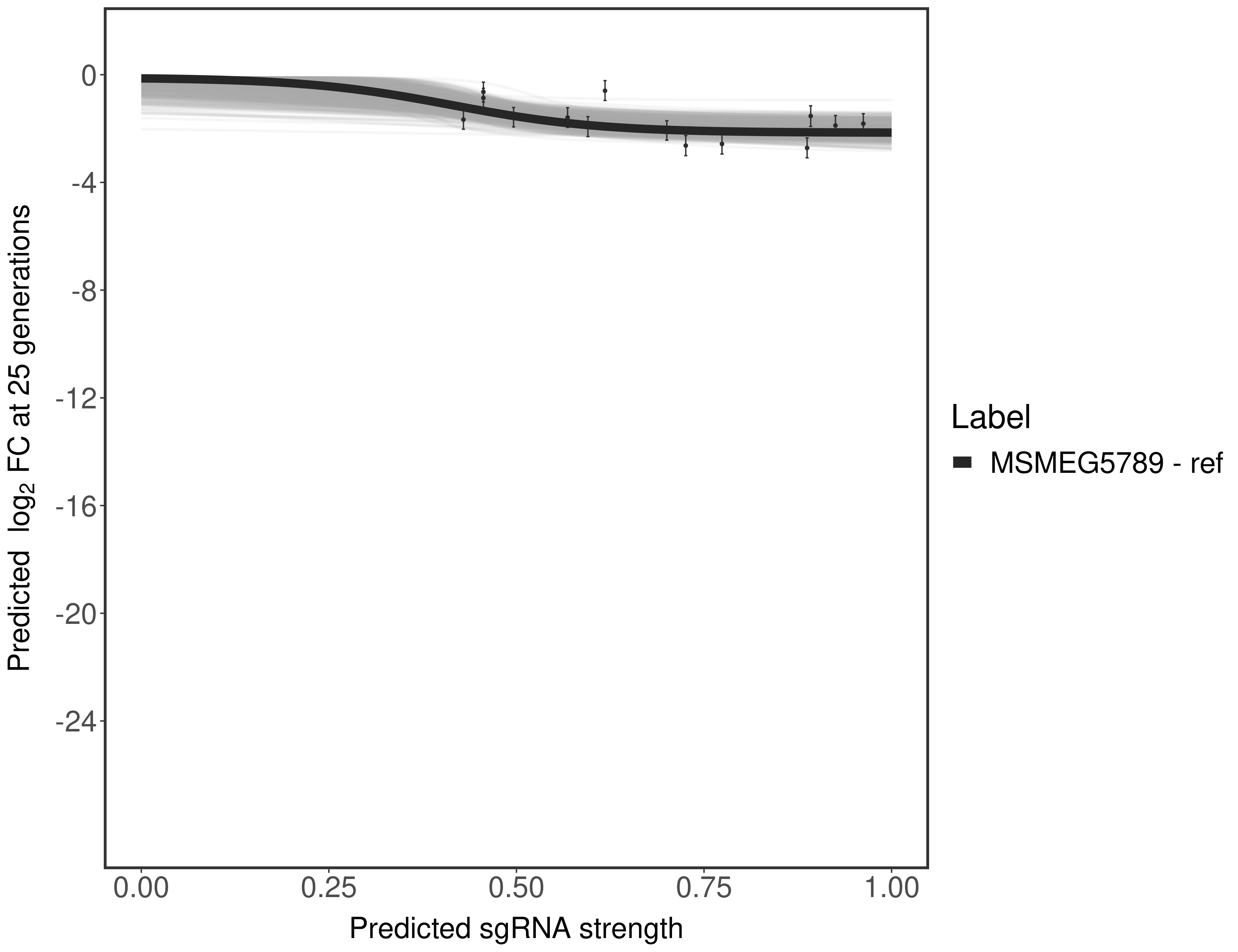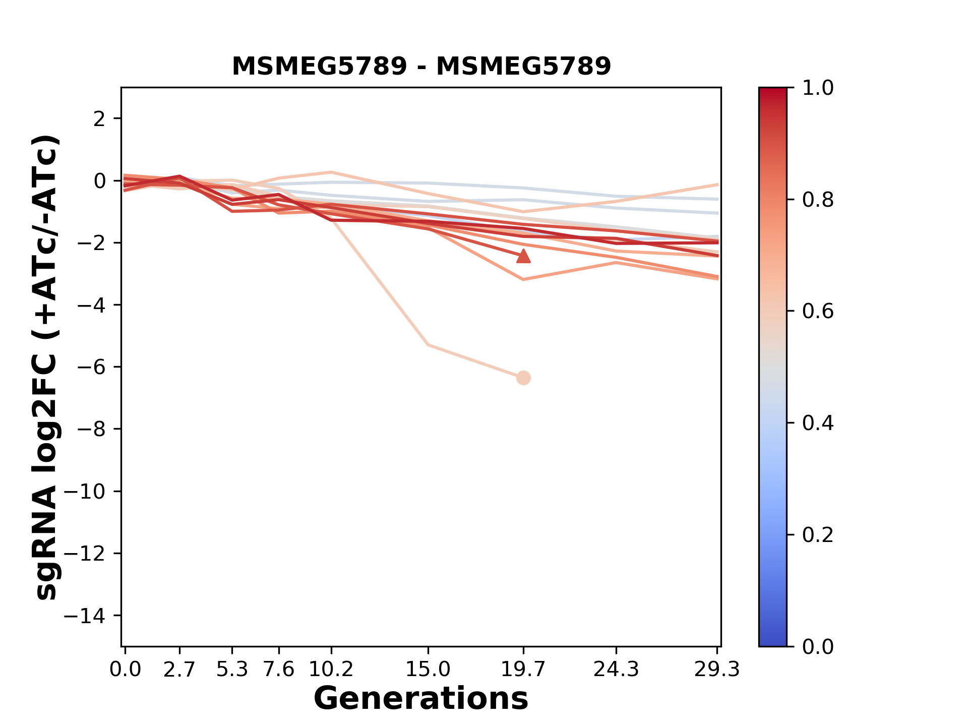 Experiment: We designed an M. tuberculosis CRISPRi library (RLC12) to target all annotated Mtb genes with single guide RNAs (sgRNAs) of varying predicted knockdown efficiencies. In parallel, we constructed a M. smegmatis CRISPRi library (RLC11) to target all annotated Msmeg genes, similar to the Mtb sgRNA library. RLC12 was transformed into M. tuberculosis H37Rv; RLC11 into M. smegmatis mc2-155. We passaged both CRISPRi libraries for nearly 30 generations in the presence or absence of the CRISPRi-inducer anhydrotetracycline (ATc). At the indicated timepoints, genomic DNA was harvested and the representation of individual sgRNAs was counted using Illumina sequencing. Here, we show sgRNA log2 fold-change values (L2FC) (plus versus minus ATc) over consecutive generations for sgRNAs targeting the gene you selected. sgRNAs are color-coded based on their predicted strength from blue (strength=0; weak) to red (strength=1; strong).