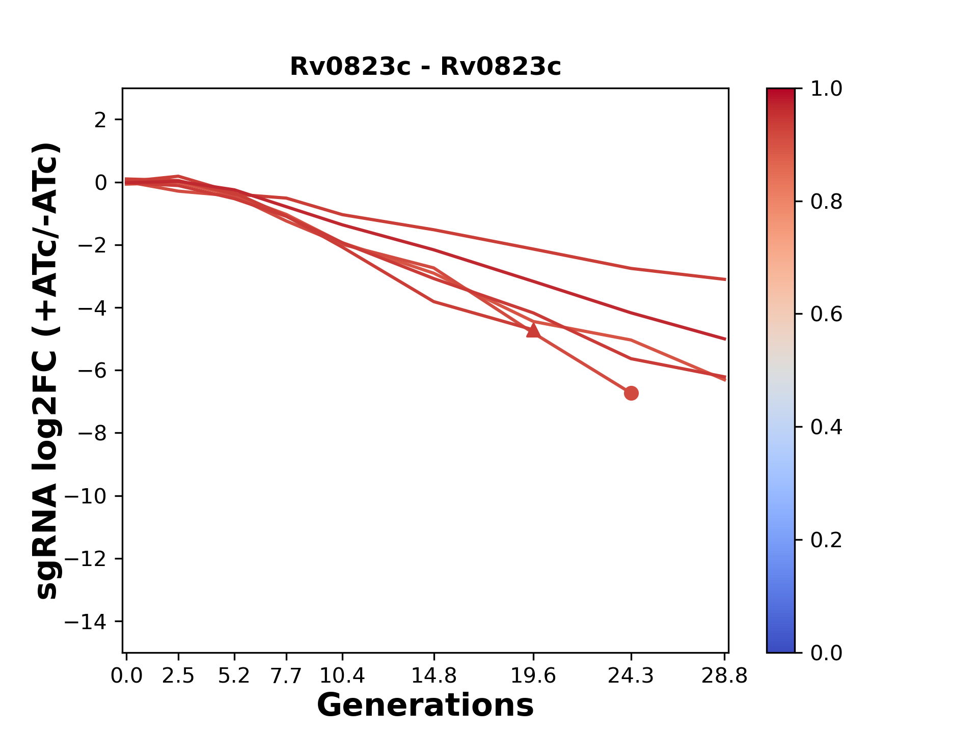 Here, we show sgRNA log2 fold-change values (L2FC) (plus versus minus ATc) over consecutive generations for sgRNAs targeting the gene you selected.