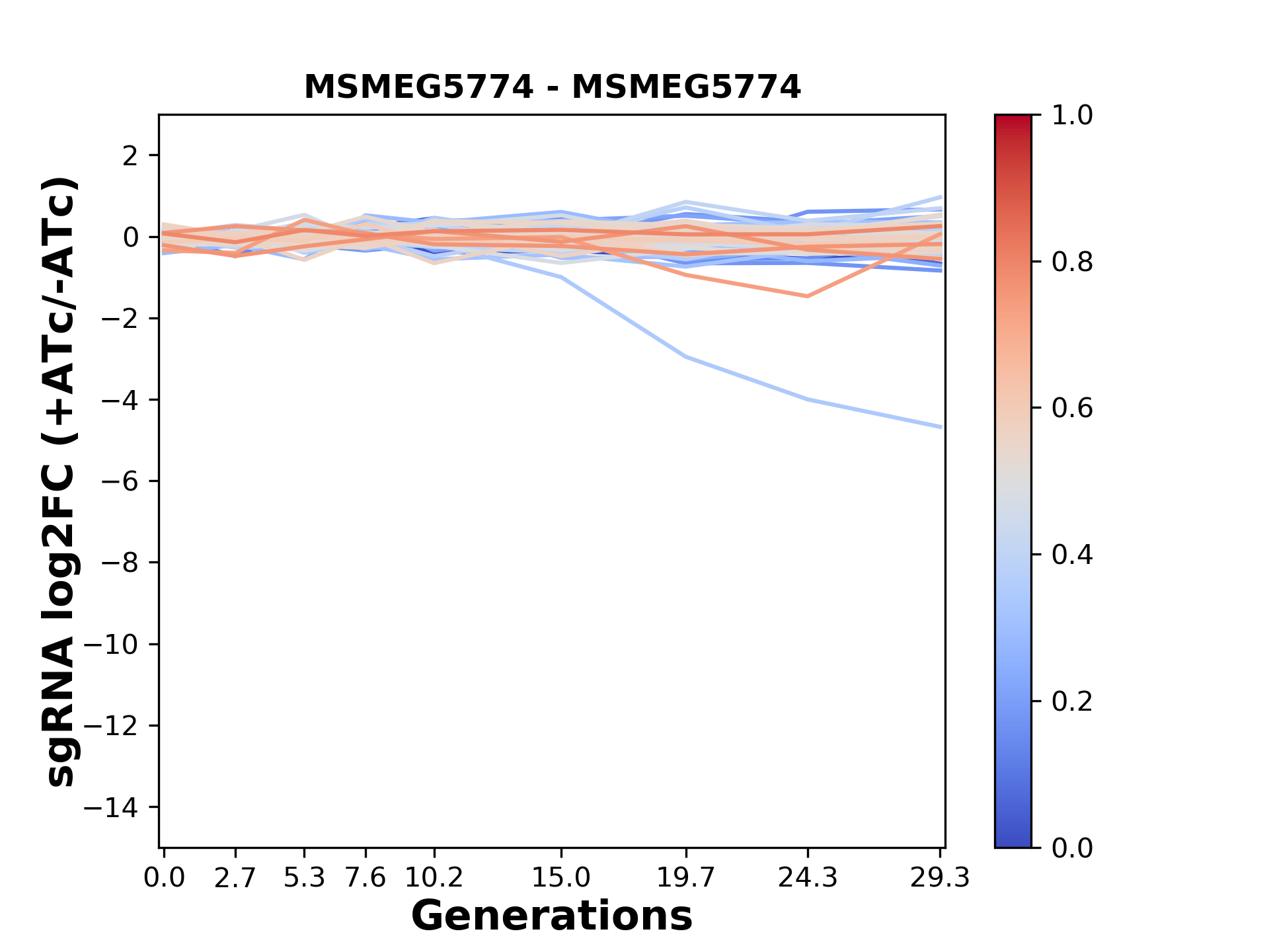 Experiment: We designed an M. tuberculosis CRISPRi library (RLC12) to target all annotated Mtb genes with single guide RNAs (sgRNAs) of varying predicted knockdown efficiencies. In parallel, we constructed a M. smegmatis CRISPRi library (RLC11) to target all annotated Msmeg genes, similar to the Mtb sgRNA library. RLC12 was transformed into M. tuberculosis H37Rv; RLC11 into M. smegmatis mc2-155. We passaged both CRISPRi libraries for nearly 30 generations in the presence or absence of the CRISPRi-inducer anhydrotetracycline (ATc). At the indicated timepoints, genomic DNA was harvested and the representation of individual sgRNAs was counted using Illumina sequencing. Here, we show sgRNA log2 fold-change values (L2FC) (plus versus minus ATc) over consecutive generations for sgRNAs targeting the gene you selected. sgRNAs are color-coded based on their predicted strength from blue (strength=0; weak) to red (strength=1; strong).