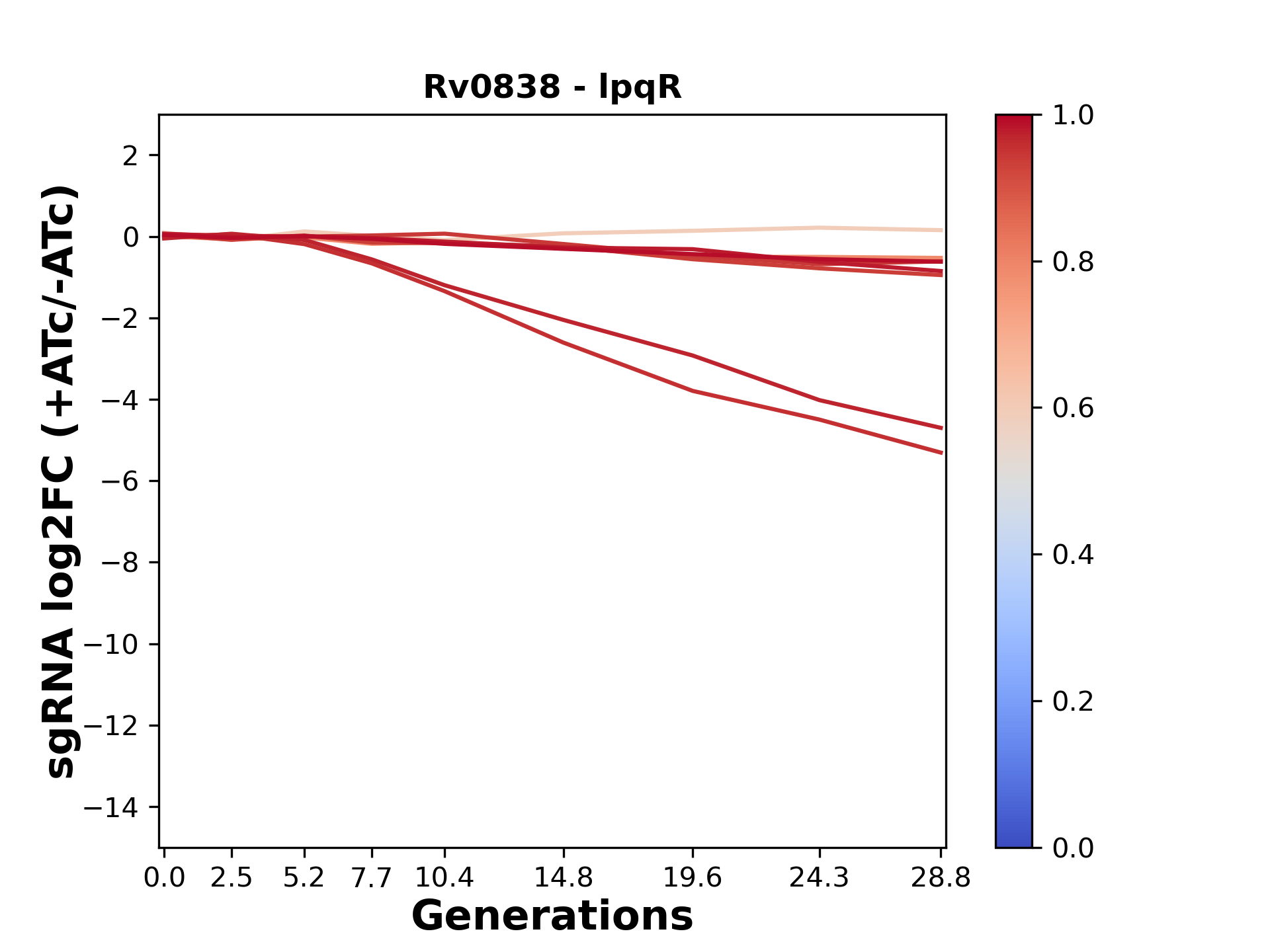Here, we show sgRNA log2 fold-change values (L2FC) (plus versus minus ATc) over consecutive generations for sgRNAs targeting the gene you selected.