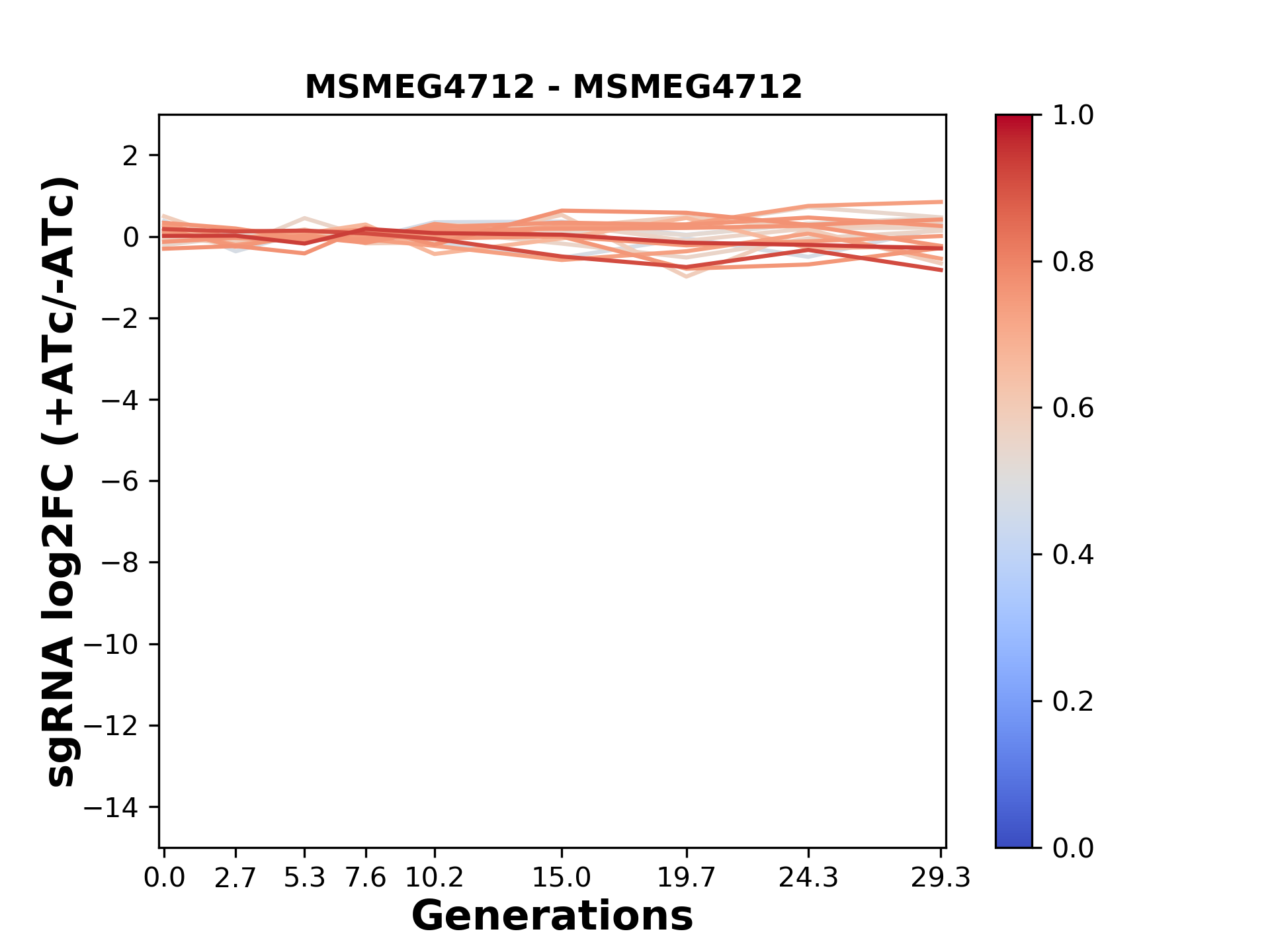 Here, we show sgRNA log2 fold-change values (L2FC) (plus versus minus ATc) over consecutive generations for sgRNAs targeting the gene you selected.