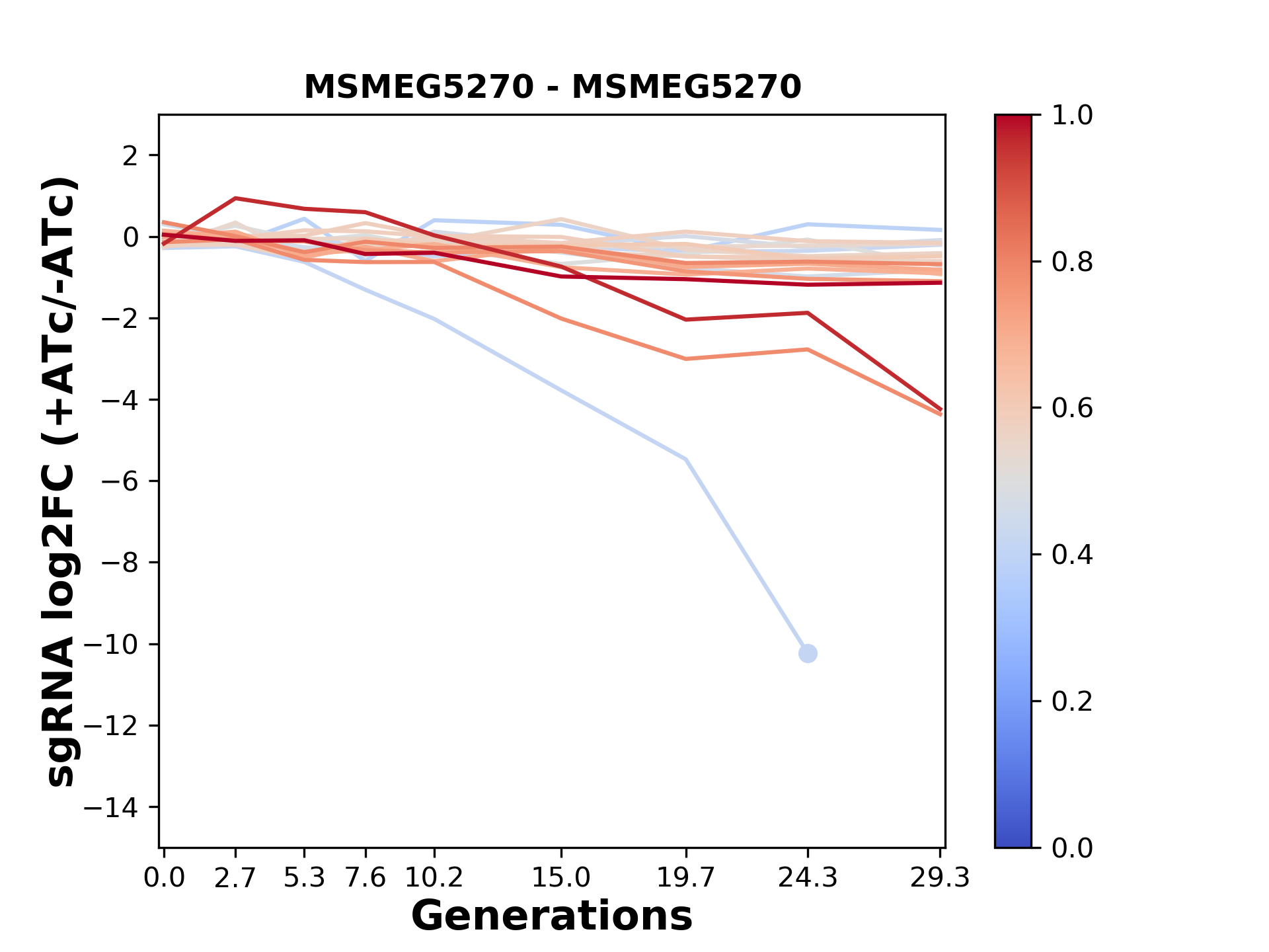 Experiment: We designed an M. tuberculosis CRISPRi library (RLC12) to target all annotated Mtb genes with single guide RNAs (sgRNAs) of varying predicted knockdown efficiencies. In parallel, we constructed a M. smegmatis CRISPRi library (RLC11) to target all annotated Msmeg genes, similar to the Mtb sgRNA library. RLC12 was transformed into M. tuberculosis H37Rv; RLC11 into M. smegmatis mc2-155. We passaged both CRISPRi libraries for nearly 30 generations in the presence or absence of the CRISPRi-inducer anhydrotetracycline (ATc). At the indicated timepoints, genomic DNA was harvested and the representation of individual sgRNAs was counted using Illumina sequencing. Here, we show sgRNA log2 fold-change values (L2FC) (plus versus minus ATc) over consecutive generations for sgRNAs targeting the gene you selected. sgRNAs are color-coded based on their predicted strength from blue (strength=0; weak) to red (strength=1; strong).