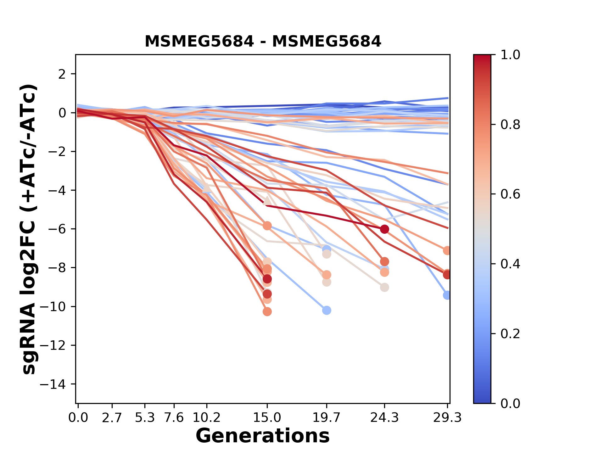 Here, we show sgRNA log2 fold-change values (L2FC) (plus versus minus ATc) over consecutive generations for sgRNAs targeting the gene you selected.