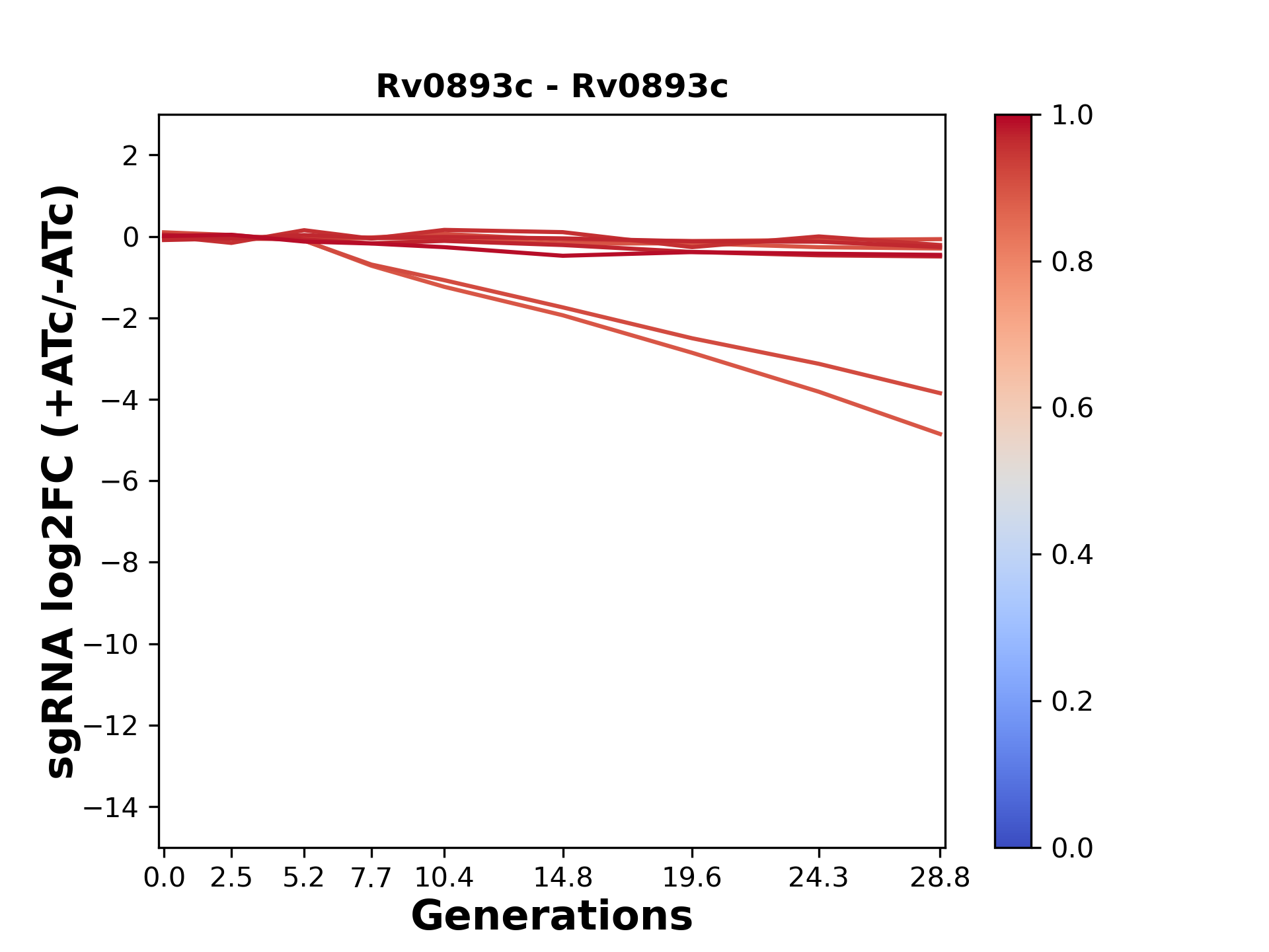 Here, we show sgRNA log2 fold-change values (L2FC) (plus versus minus ATc) over consecutive generations for sgRNAs targeting the gene you selected.
