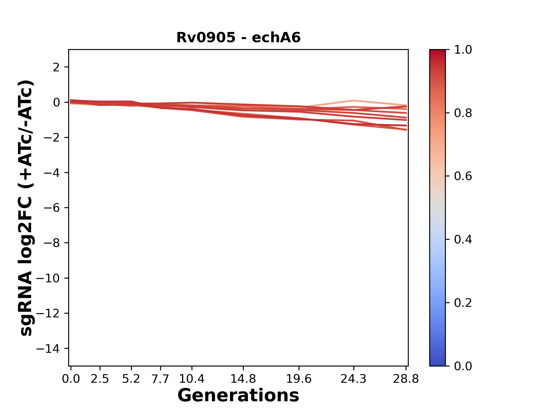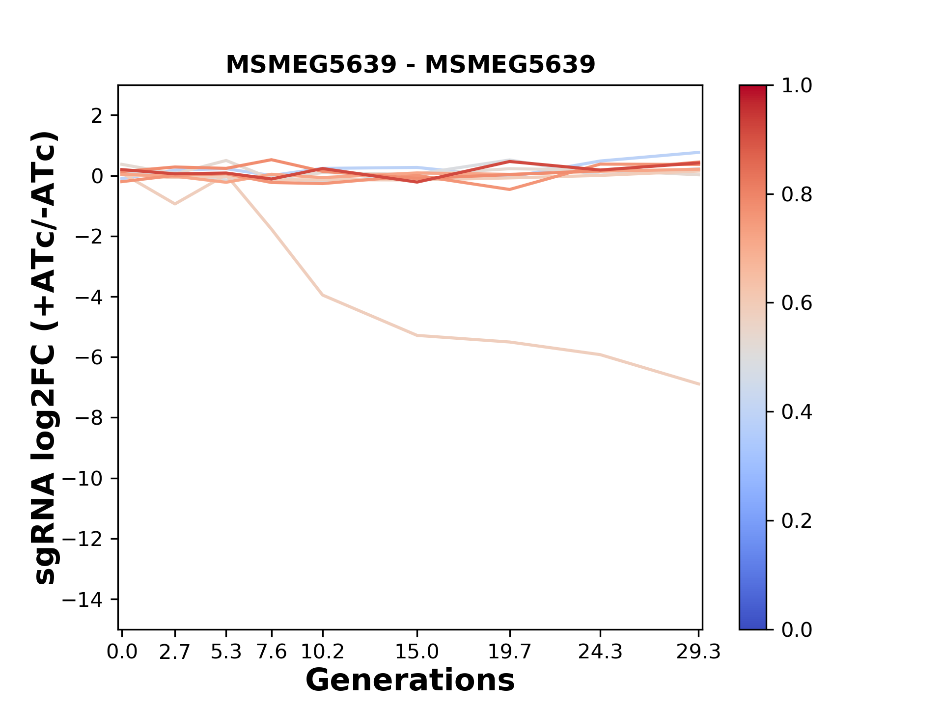 Here, we show sgRNA log2 fold-change values (L2FC) (plus versus minus ATc) over consecutive generations for sgRNAs targeting the gene you selected.