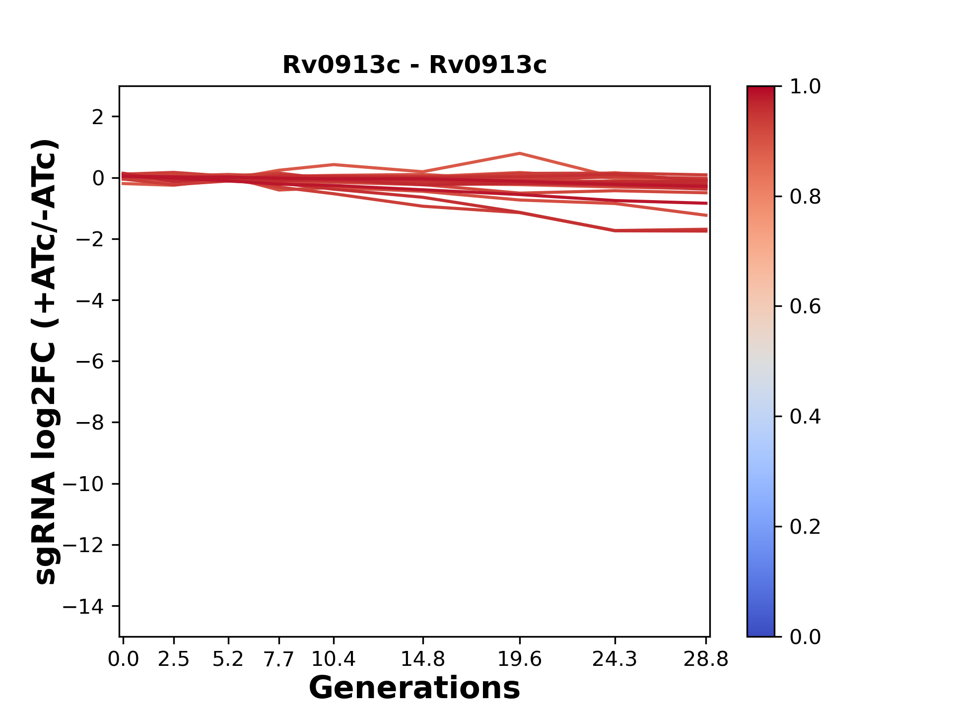 Here, we show sgRNA log2 fold-change values (L2FC) (plus versus minus ATc) over consecutive generations for sgRNAs targeting the gene you selected.