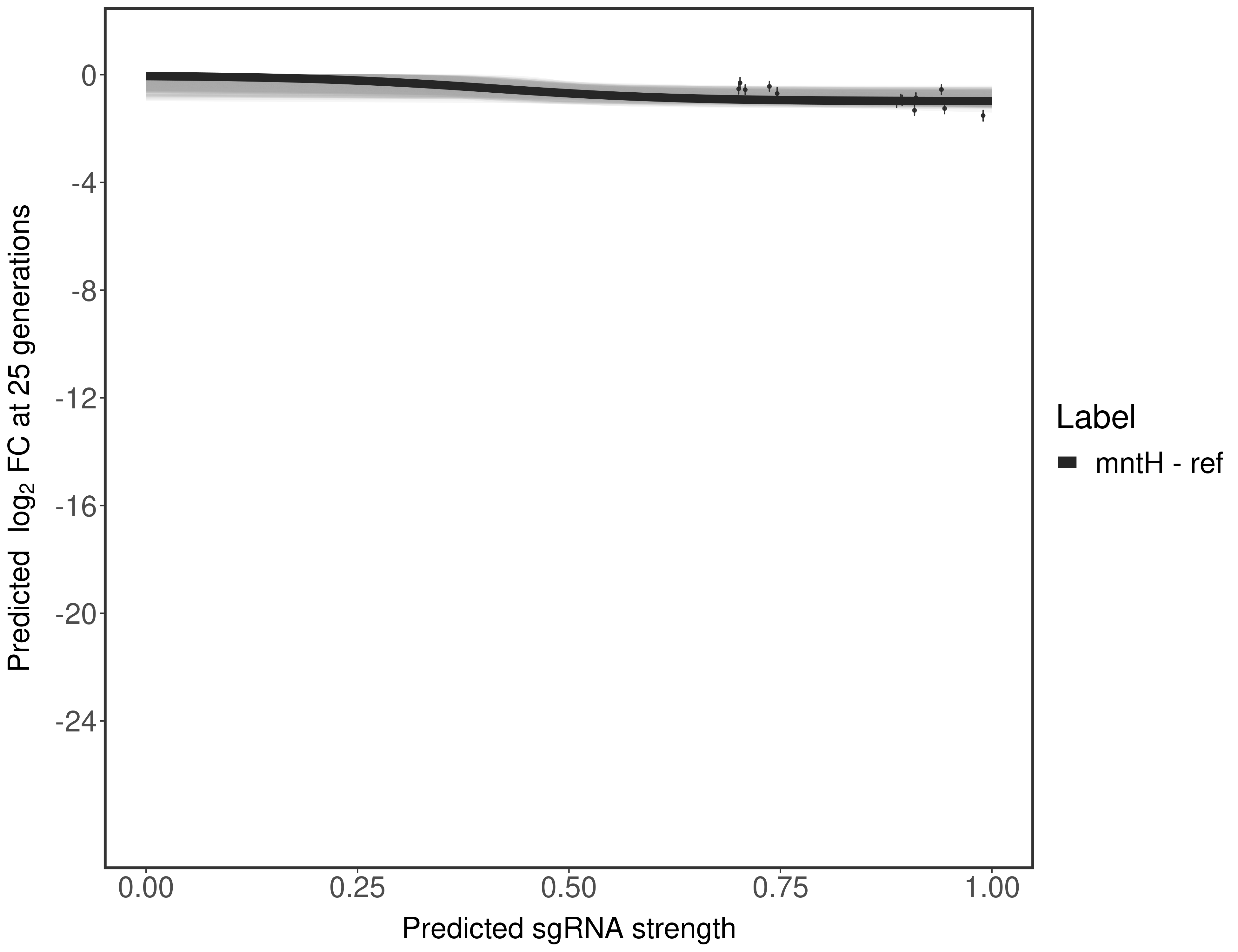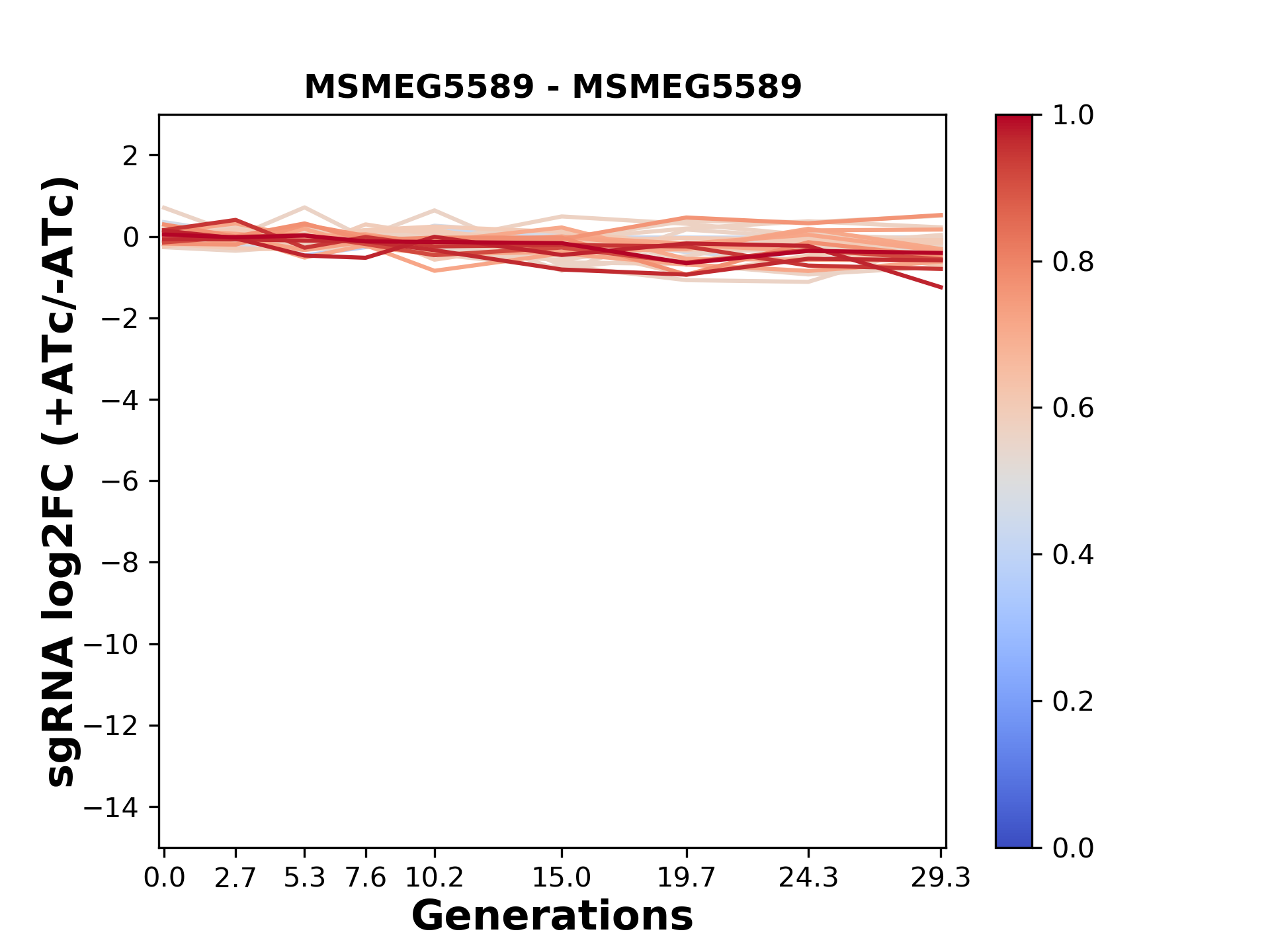 Here, we show sgRNA log2 fold-change values (L2FC) (plus versus minus ATc) over consecutive generations for sgRNAs targeting the gene you selected.