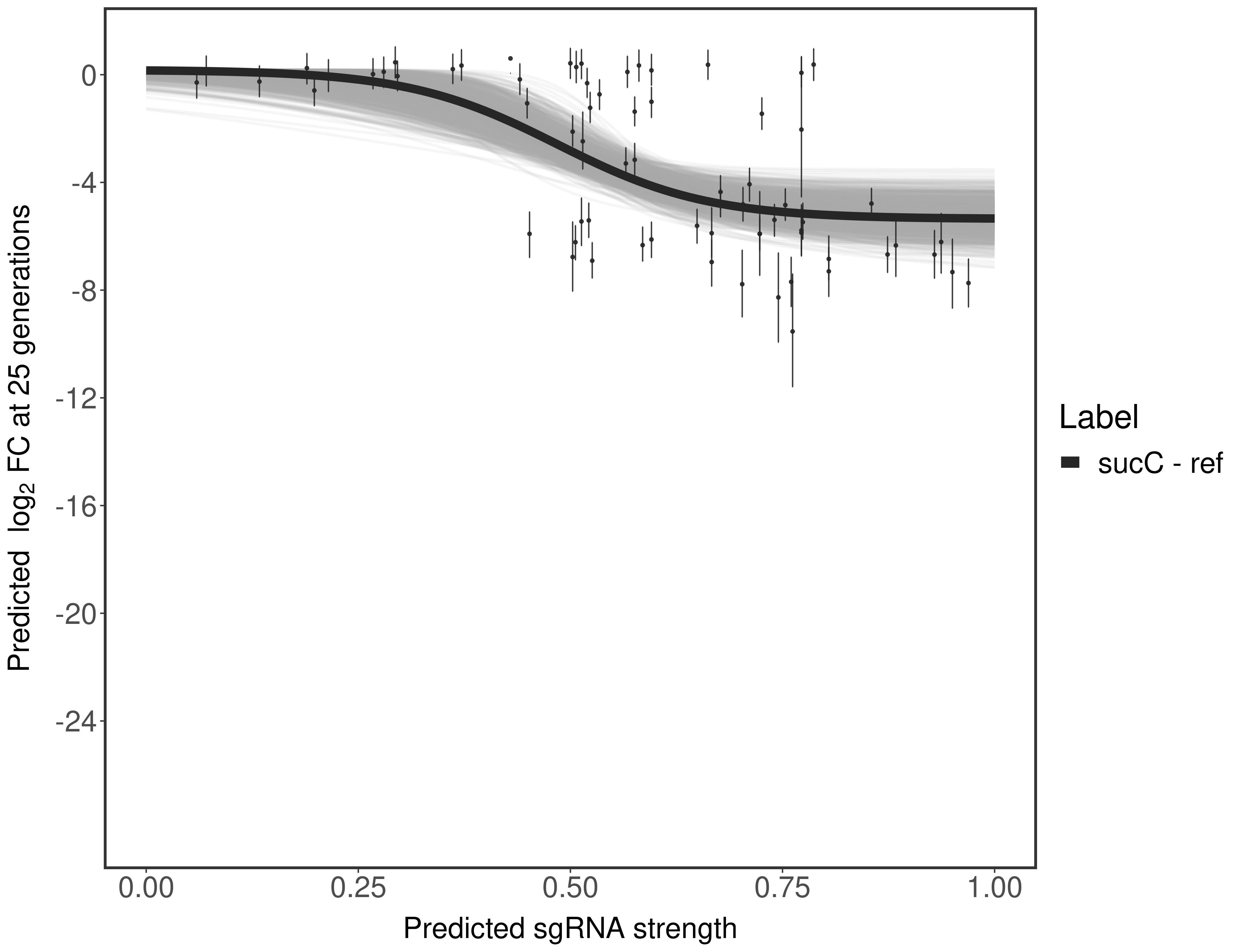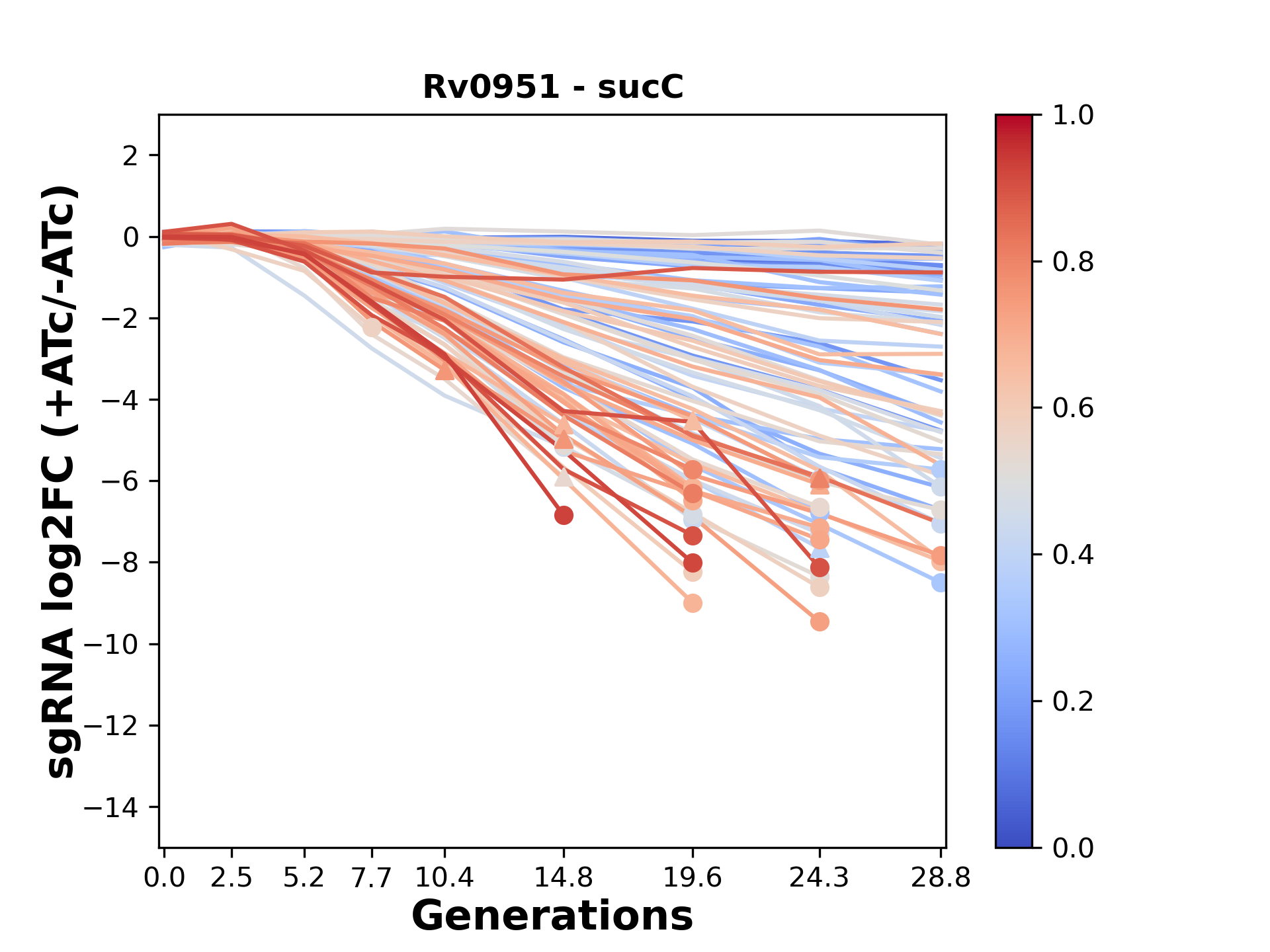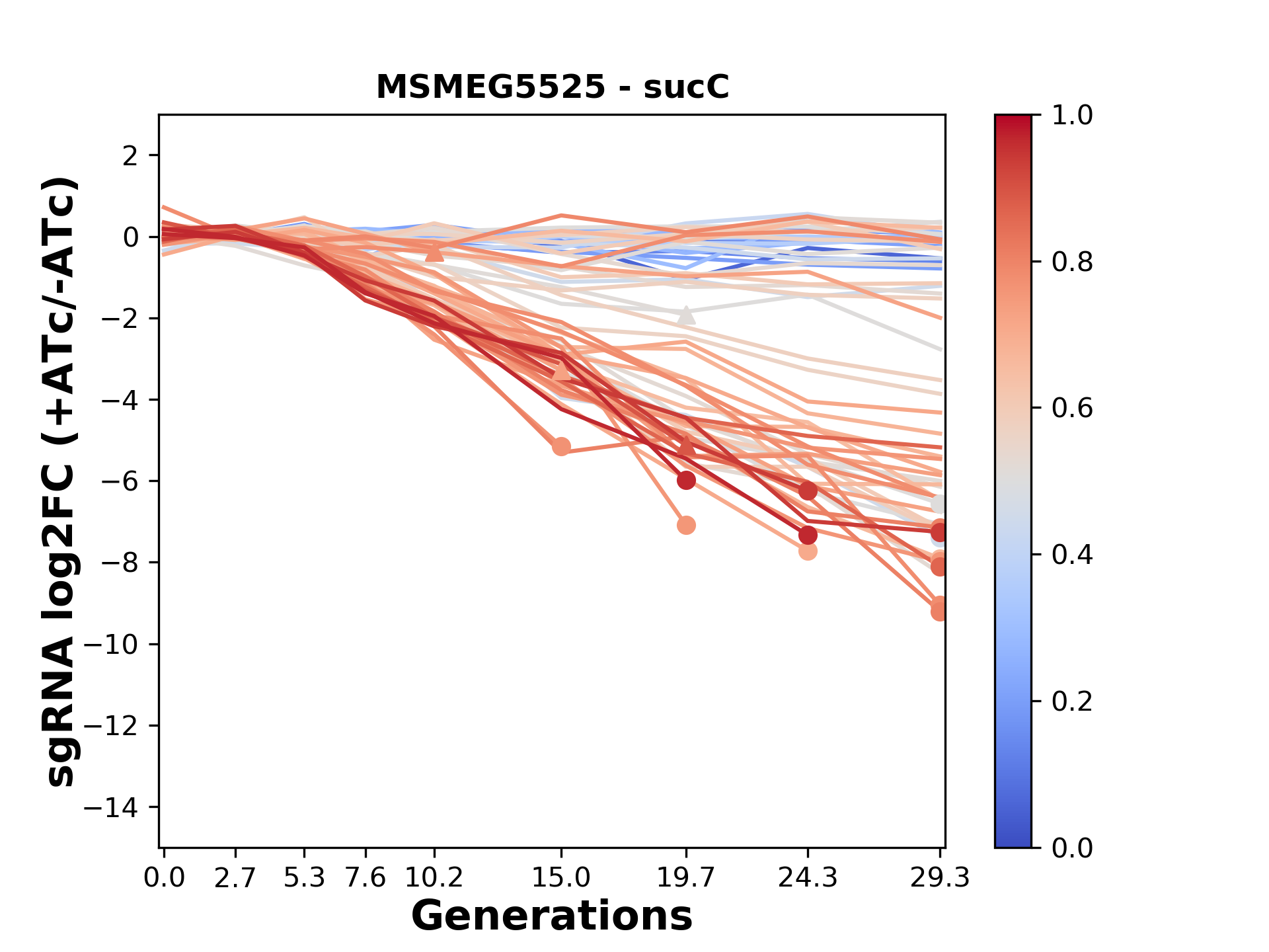 Here, we show sgRNA log2 fold-change values (L2FC) (plus versus minus ATc) over consecutive generations for sgRNAs targeting the gene you selected.