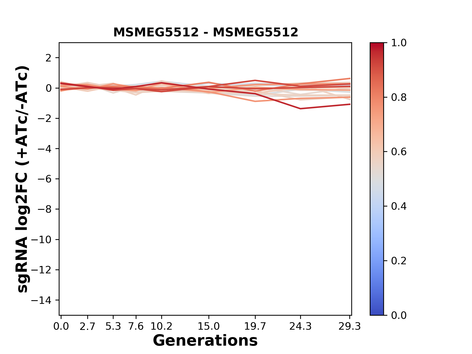 Here, we show sgRNA log2 fold-change values (L2FC) (plus versus minus ATc) over consecutive generations for sgRNAs targeting the gene you selected.