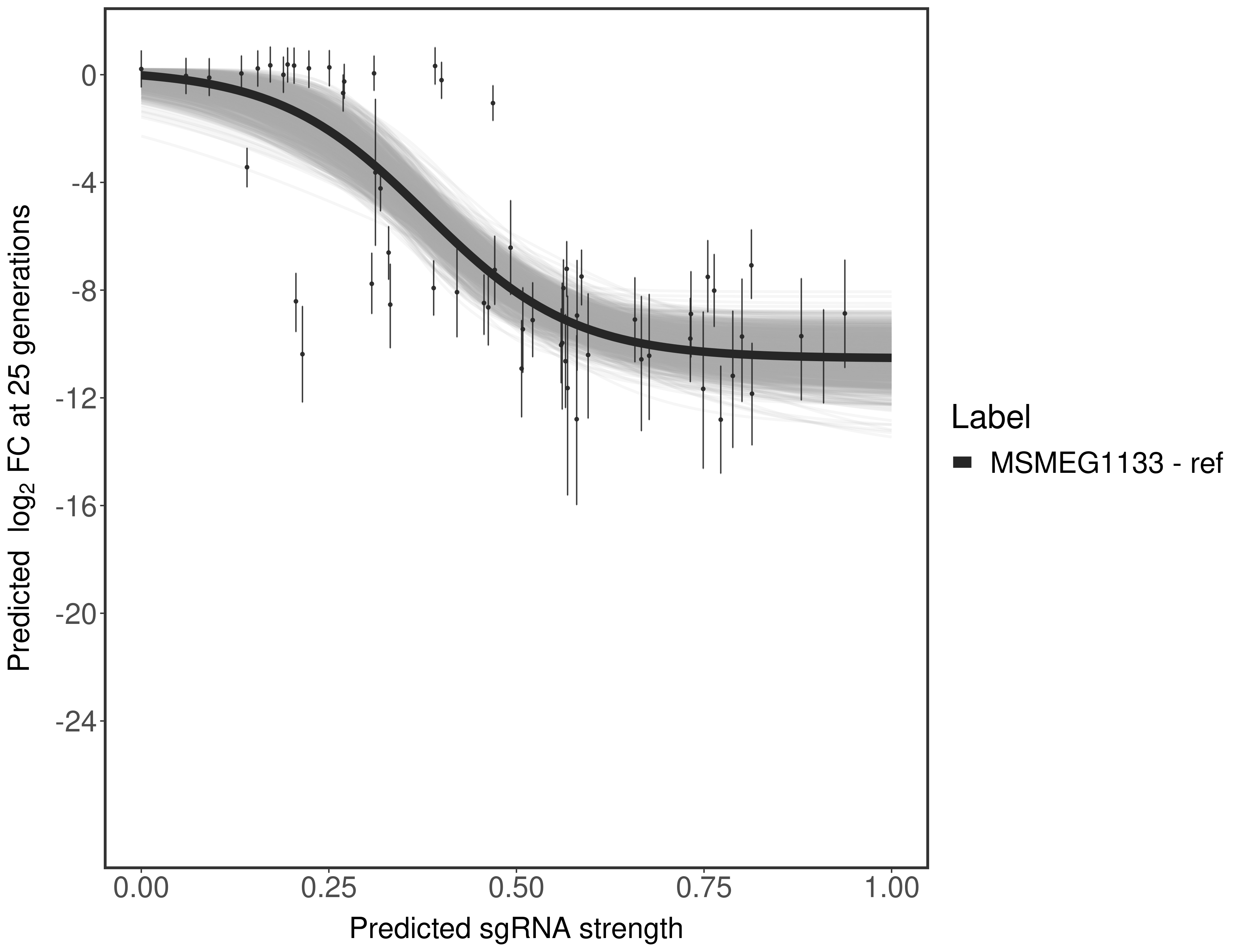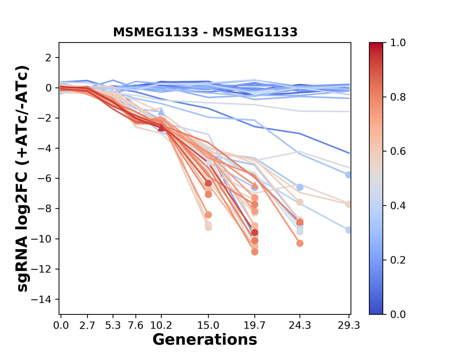 Experiment: We designed an M. tuberculosis CRISPRi library (RLC12) to target all annotated Mtb genes with single guide RNAs (sgRNAs) of varying predicted knockdown efficiencies. In parallel, we constructed a M. smegmatis CRISPRi library (RLC11) to target all annotated Msmeg genes, similar to the Mtb sgRNA library. RLC12 was transformed into M. tuberculosis H37Rv; RLC11 into M. smegmatis mc2-155. We passaged both CRISPRi libraries for nearly 30 generations in the presence or absence of the CRISPRi-inducer anhydrotetracycline (ATc). At the indicated timepoints, genomic DNA was harvested and the representation of individual sgRNAs was counted using Illumina sequencing. Here, we show sgRNA log2 fold-change values (L2FC) (plus versus minus ATc) over consecutive generations for sgRNAs targeting the gene you selected. sgRNAs are color-coded based on their predicted strength from blue (strength=0; weak) to red (strength=1; strong).