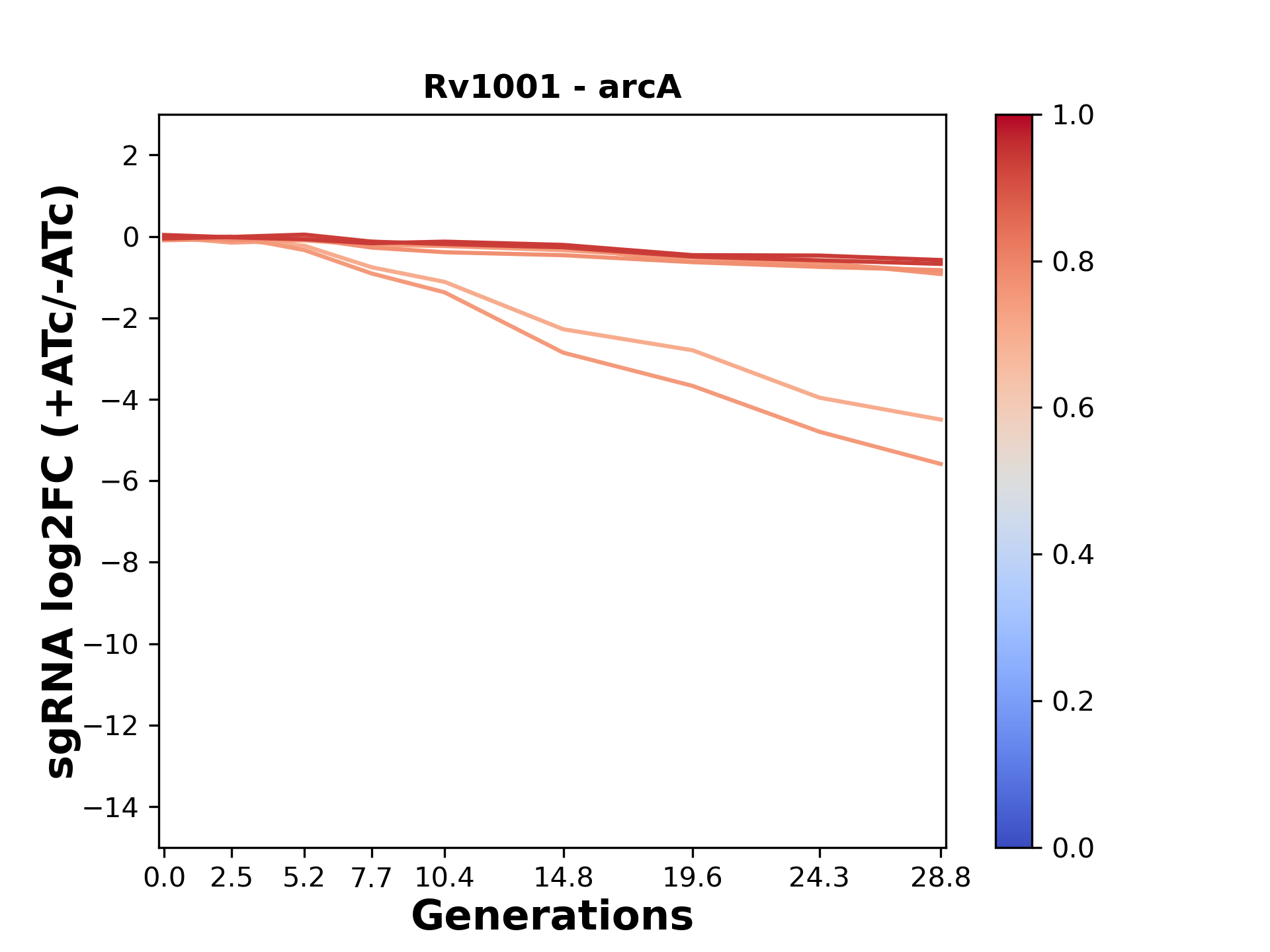 Experiment: We designed an M. tuberculosis CRISPRi library (RLC12) to target all annotated Mtb genes with single guide RNAs (sgRNAs) of varying predicted knockdown efficiencies. In parallel, we constructed a M. smegmatis CRISPRi library (RLC11) to target all annotated Msmeg genes, similar to the Mtb sgRNA library. RLC12 was transformed into M. tuberculosis H37Rv; RLC11 into M. smegmatis mc2-155. We passaged both CRISPRi libraries for nearly 30 generations in the presence or absence of the CRISPRi-inducer anhydrotetracycline (ATc). At the indicated timepoints, genomic DNA was harvested and the representation of individual sgRNAs was counted using Illumina sequencing. Here, we show sgRNA log2 fold-change values (L2FC) (plus versus minus ATc) over consecutive generations for sgRNAs targeting the gene you selected. sgRNAs are color-coded based on their predicted strength from blue (strength=0; weak) to red (strength=1; strong).