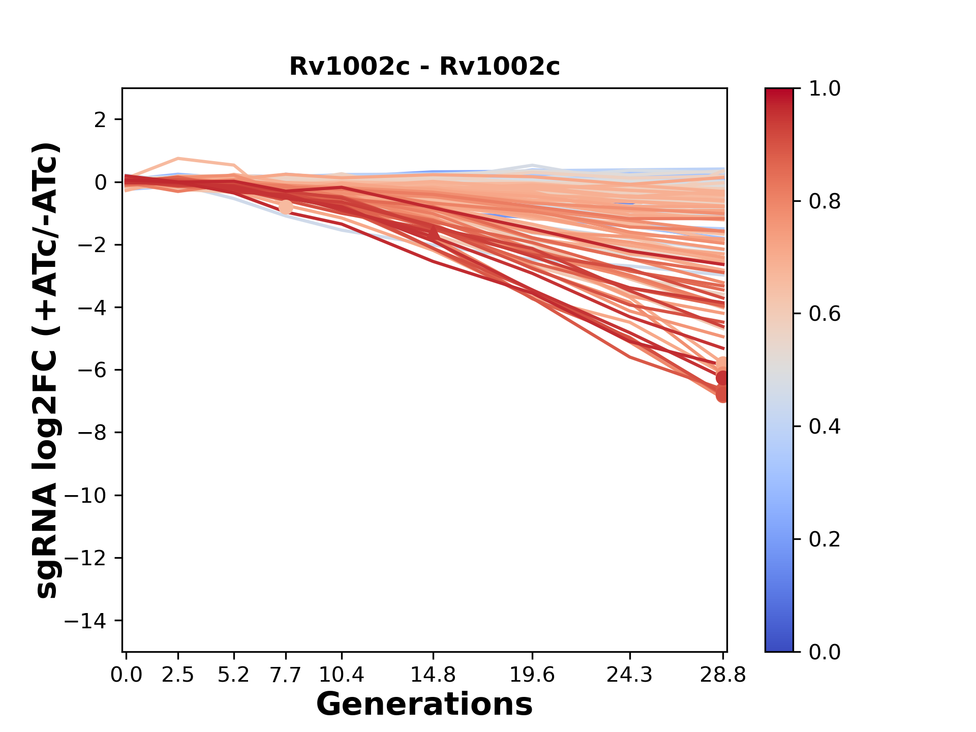 Here, we show sgRNA log2 fold-change values (L2FC) (plus versus minus ATc) over consecutive generations for sgRNAs targeting the gene you selected.