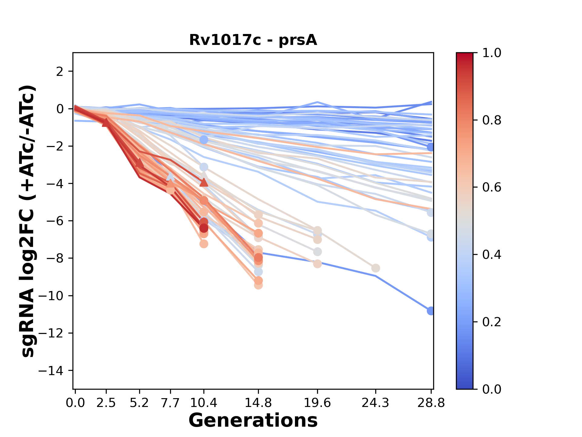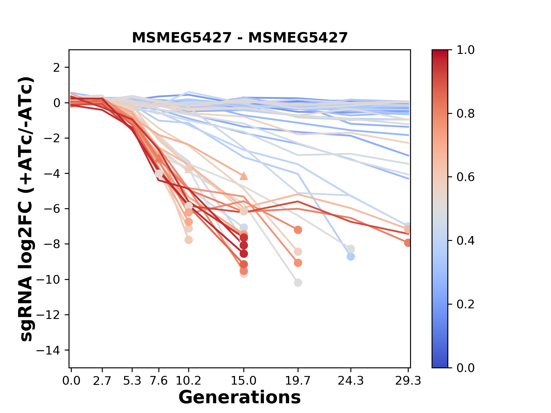 Here, we show sgRNA log2 fold-change values (L2FC) (plus versus minus ATc) over consecutive generations for sgRNAs targeting the gene you selected.