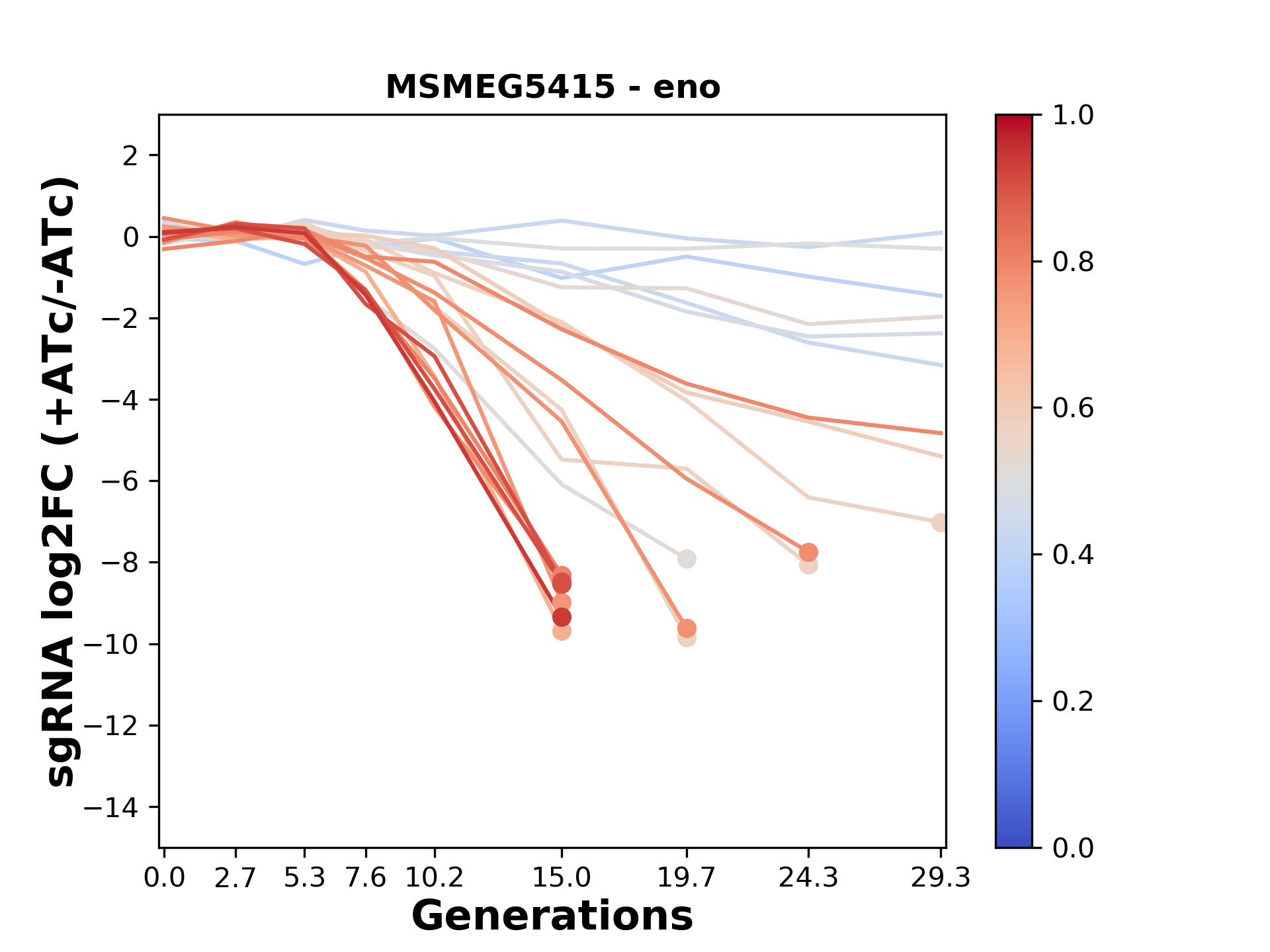 Here, we show sgRNA log2 fold-change values (L2FC) (plus versus minus ATc) over consecutive generations for sgRNAs targeting the gene you selected.