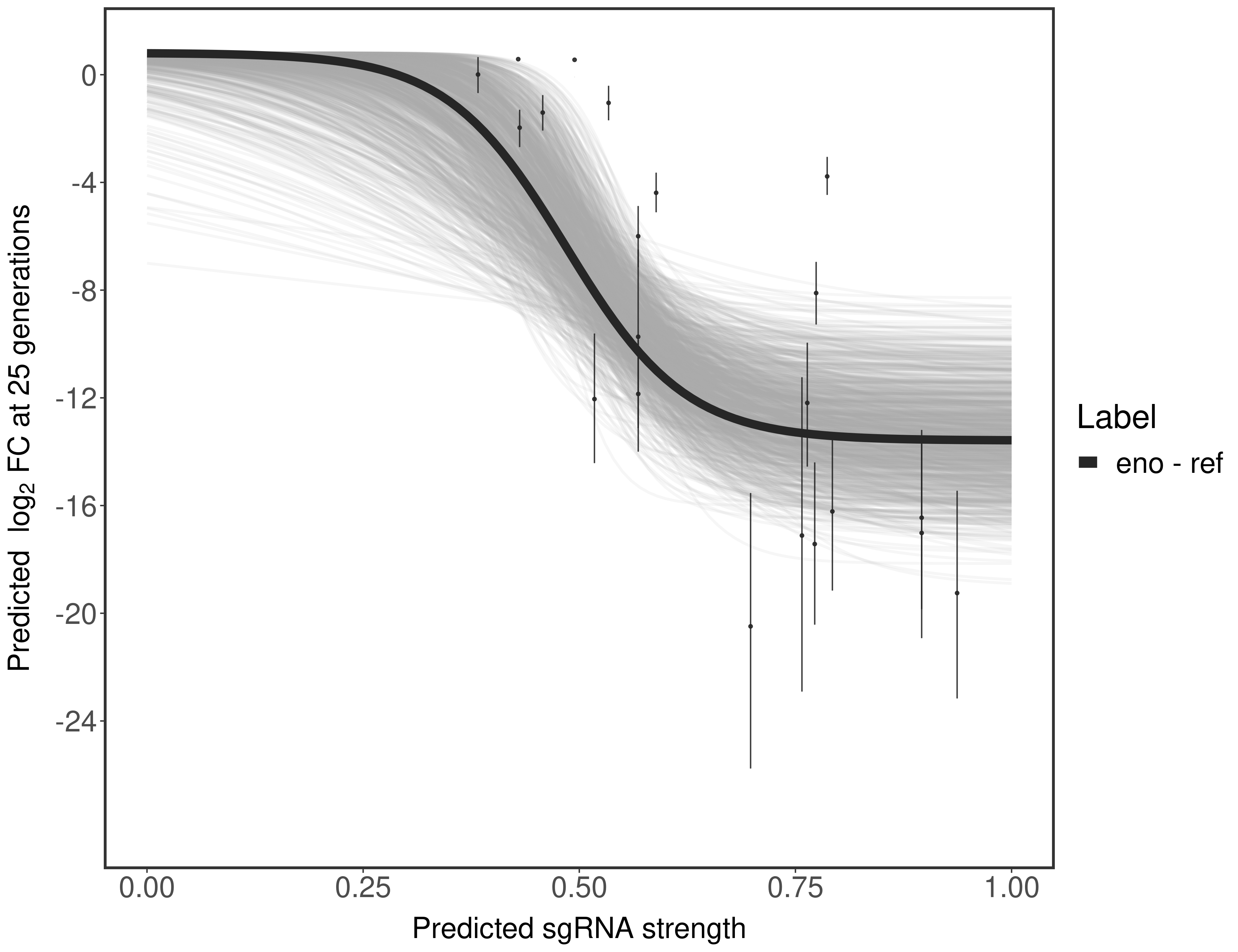 In order to quantify gene vulnerability, data were subsequently analyzed with a hierarchical model at the sgRNA level (two-line model) and gene level (Hill curve). The vulnerability quantification is shown below. [More information]